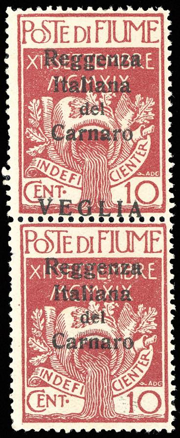 1920 - 10 cent. soprastampato in caratteri piccoli, coppia verticale, il secondo esemplare senza la soprastampa "VEGLIA", il primo con la soprastampa in basso (6gb), gomma originale, perfetta. Rara. Cert. Raybaudi.