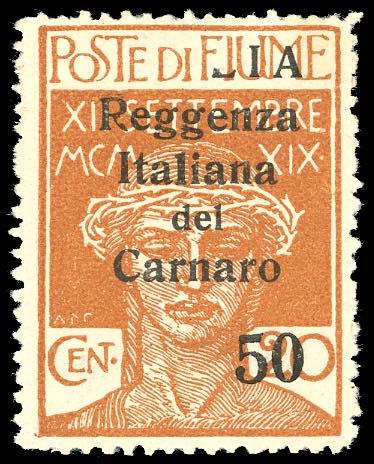 1920 - 50 cent. su 20 cent. soprastampato in caratteri piccoli, soprastampa "VEGLIA" incompleta, a causa di un'anomale piegatura del foglio al momento della soprastampa, la parte mancante della soprastampa è stata impressa al verso (6gc), gomma originale, perfetto. Varietà occasionale molto rara, probabilmente unica.