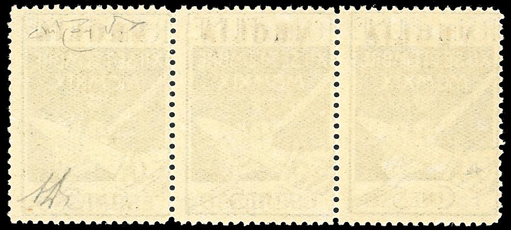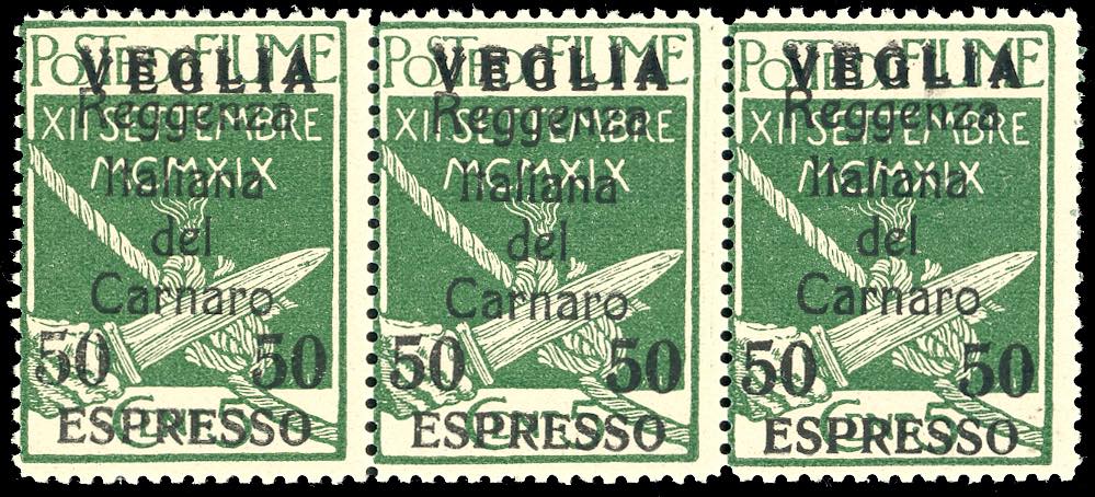 1920 - 50 cent. su 5 cent. verde, doppia soprastampa "VEGLIA" (2a), striscia orizzontale di tre, gomma originale integra, perfetta e molto fresca. Rara. A.Diena, cert. Raybaudi.