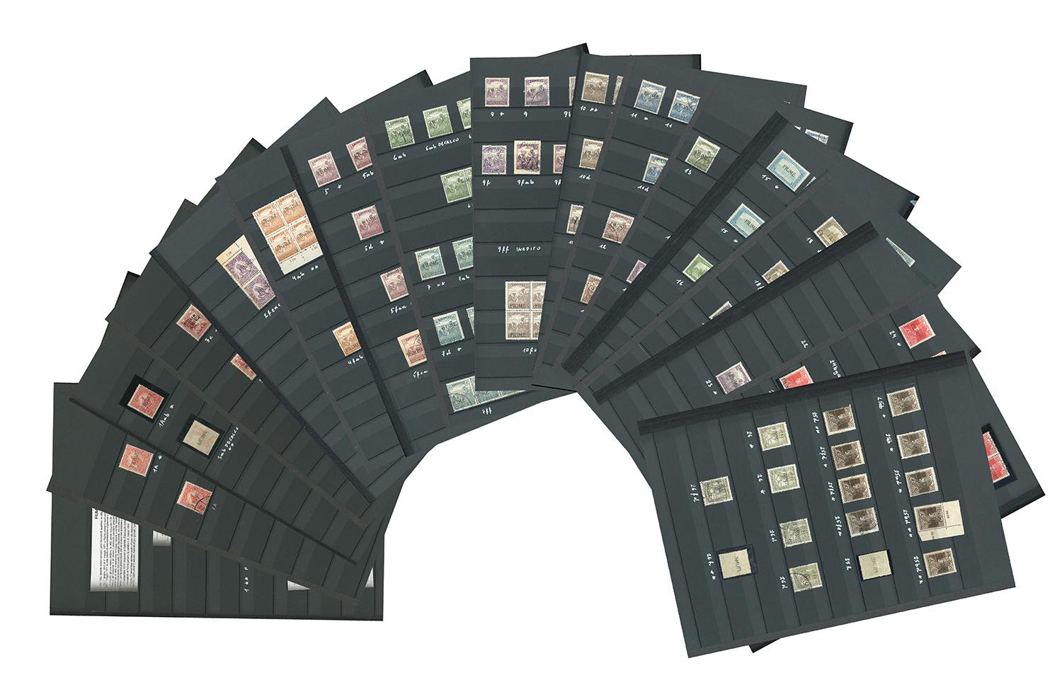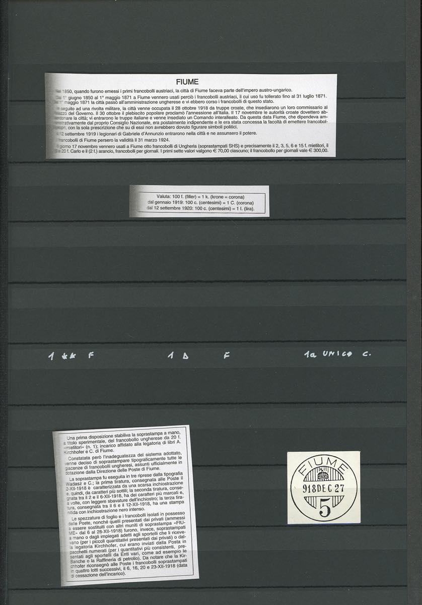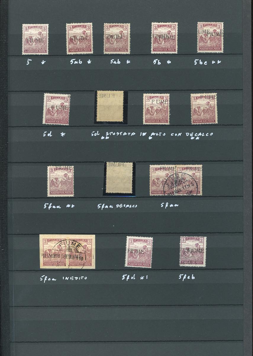 FIUME 1918/19 - Collezione di francobolli nuovi ed usati, relativi alla prima emissione con soprastampa "FIUME" a macchina, in pagine d'album con le relative classifiche. Presenti moltissime varietà anche di pregio e rare, anche non catalogate. Diversi esemplari firmati da periti attendibili. Insieme irripetibile.