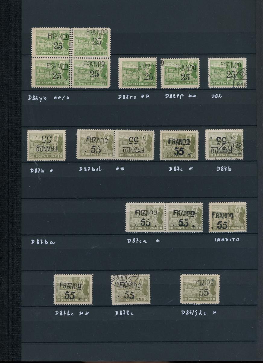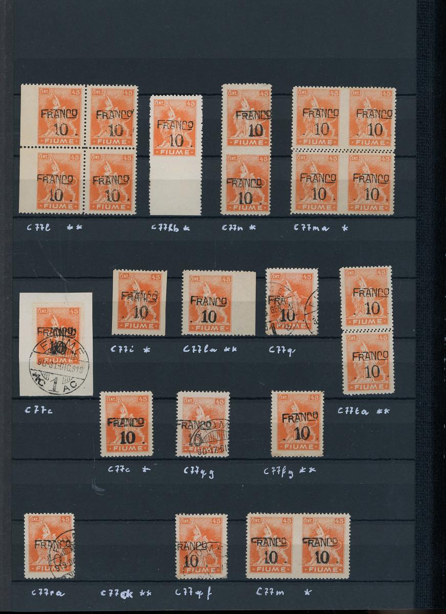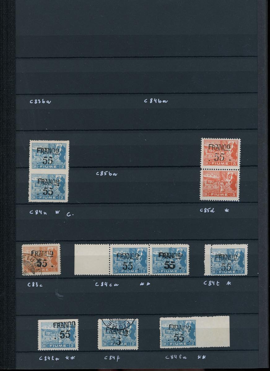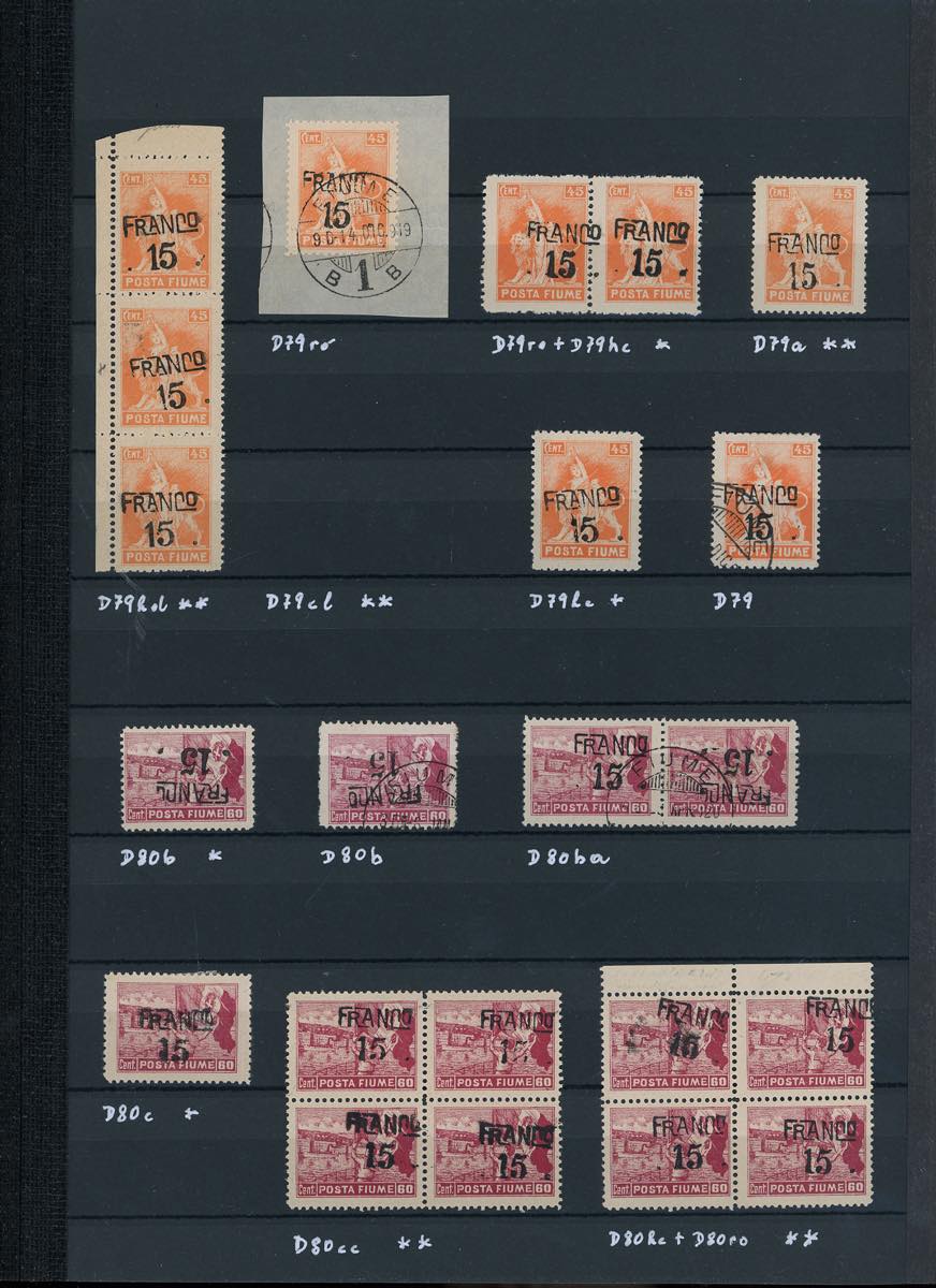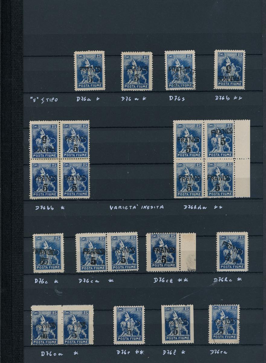 FIUME 1919 - Collezione di francobolli nuovi ed usati, relativi alla serie Allegorie e Vedute con dicitura "Posta Fiume", soprastampati e non, e alla serie Allegorie e Vedute con dicitura "Fiume" soprastampati "FRANCO", in pagine d'album con le relative classifiche. Presenti moltissime varietà anche di pregio e rare, alcune non catalogate. Diversi esemplari firmati da periti attendibili. Insieme irripetibile.
