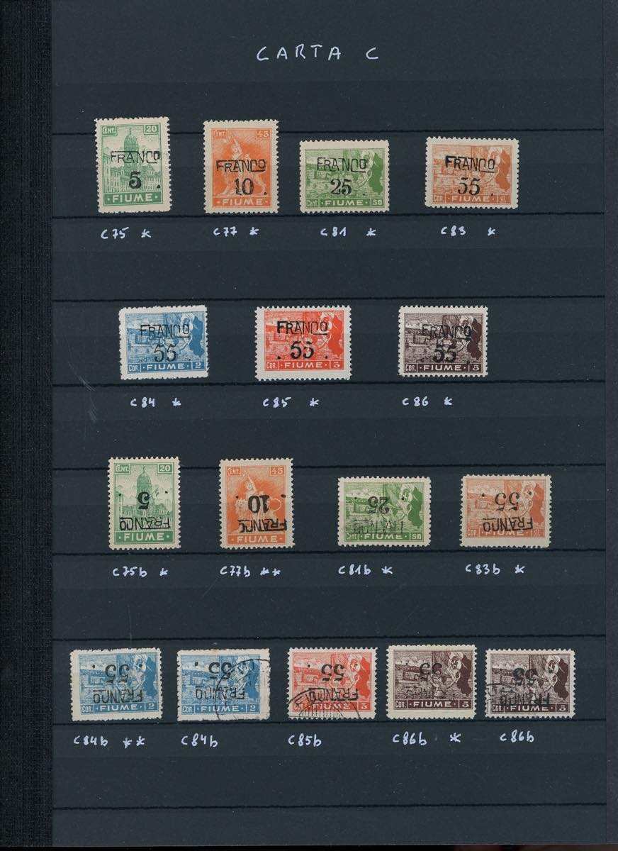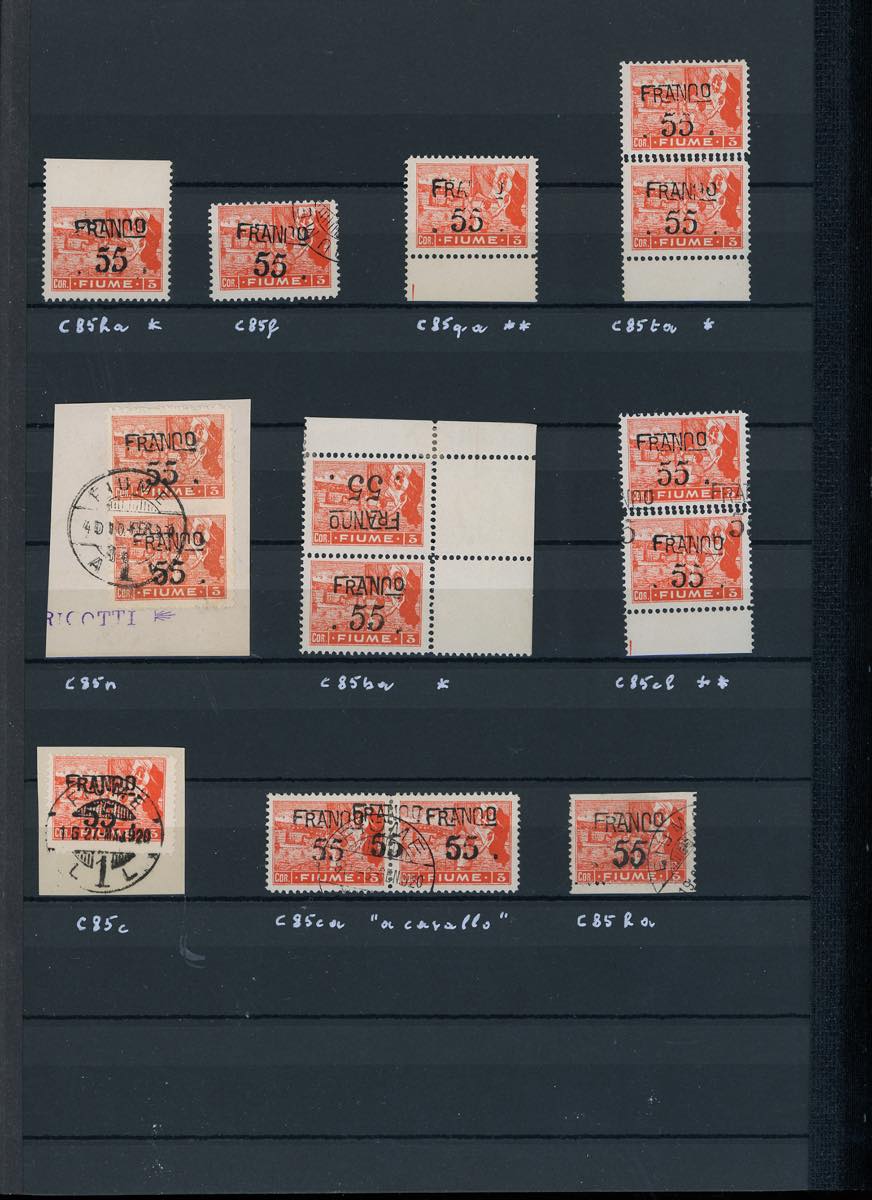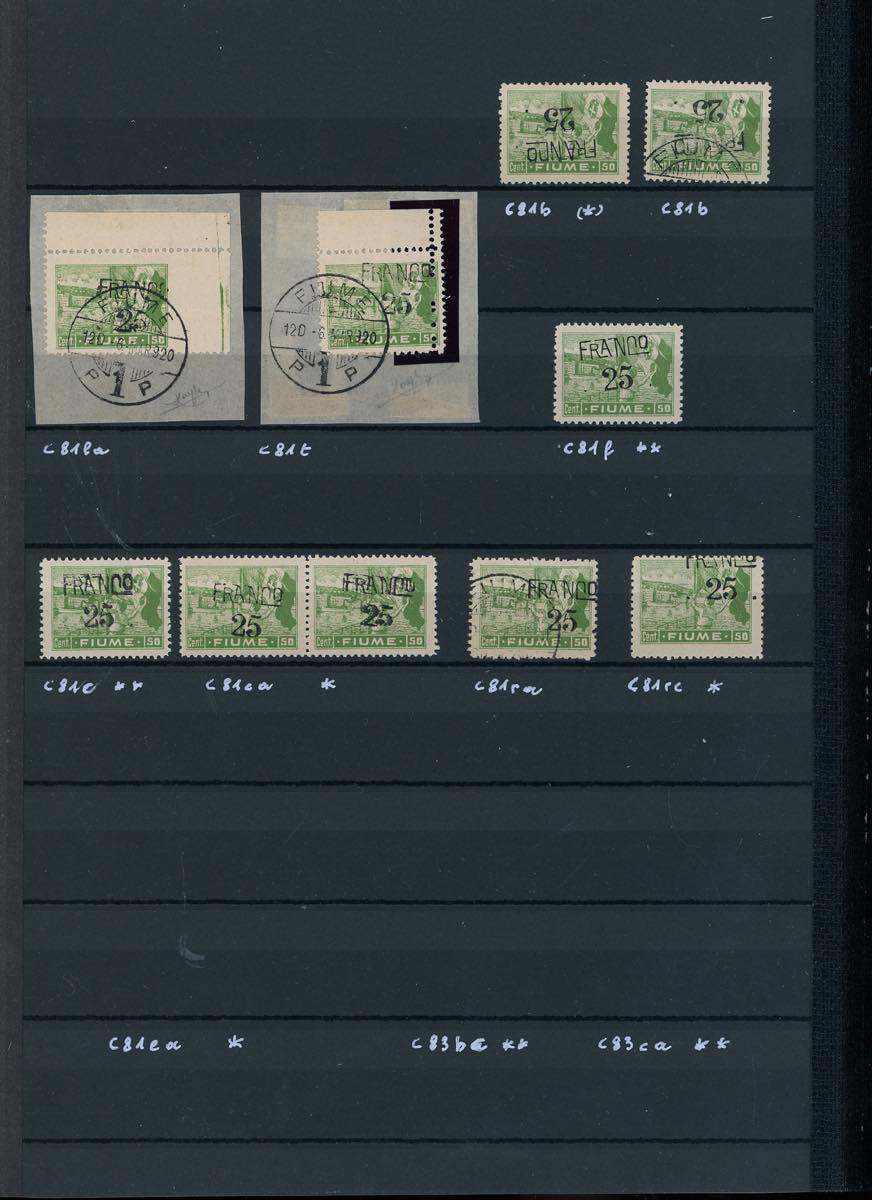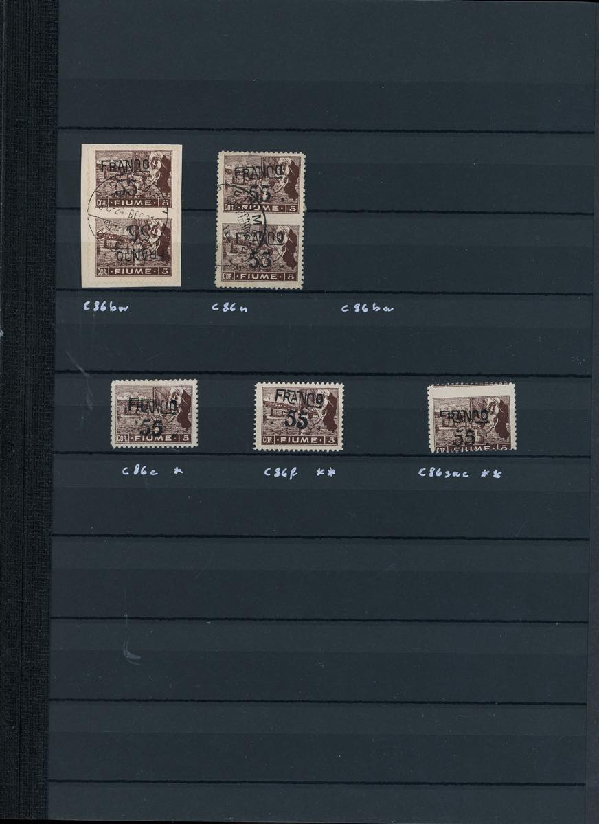 FIUME 1919 - Collezione di francobolli nuovi ed usati, relativi alla serie Allegorie e Vedute con dicitura "Posta Fiume", soprastampati e non, e alla serie Allegorie e Vedute con dicitura "Fiume" soprastampati "FRANCO", in pagine d'album con le relative classifiche. Presenti moltissime varietà anche di pregio e rare, alcune non catalogate. Diversi esemplari firmati da periti attendibili. Insieme irripetibile.
