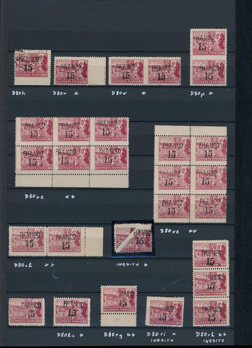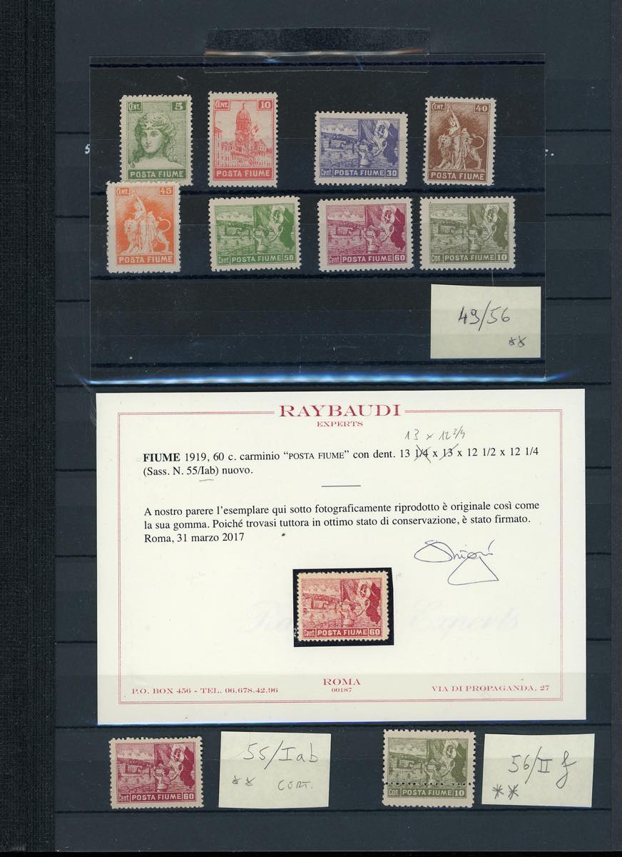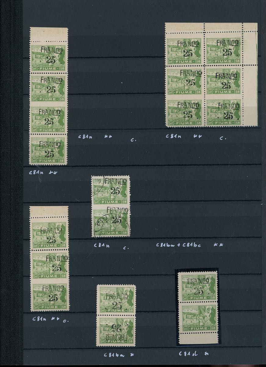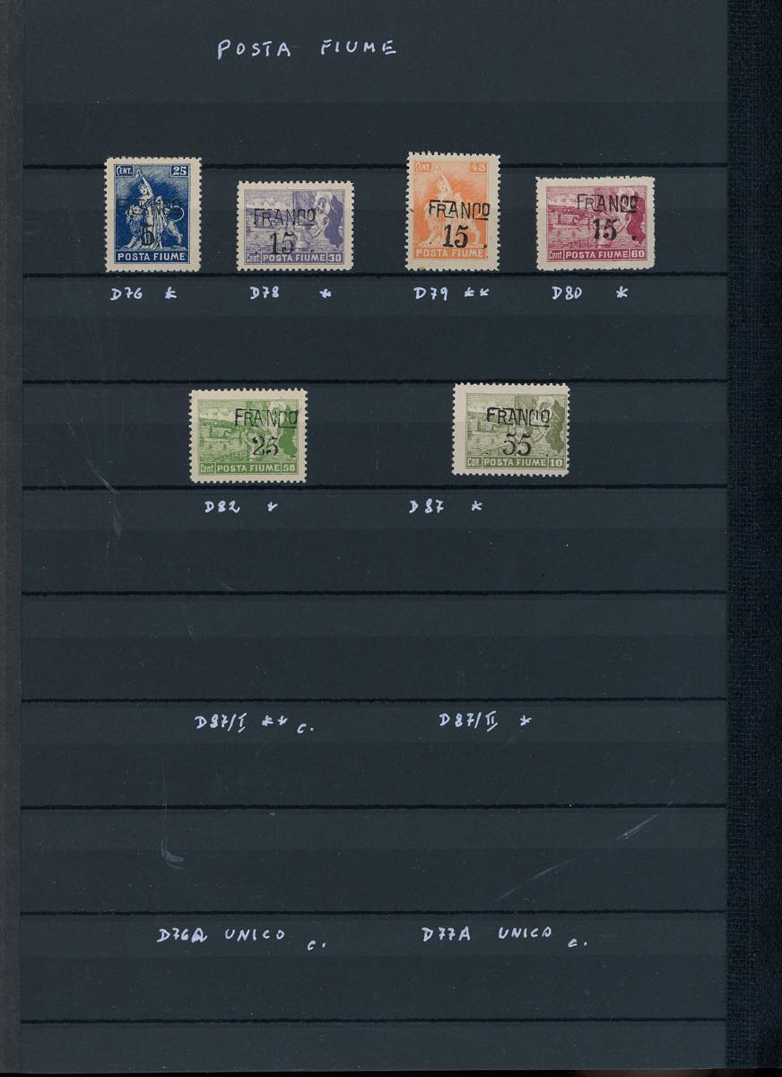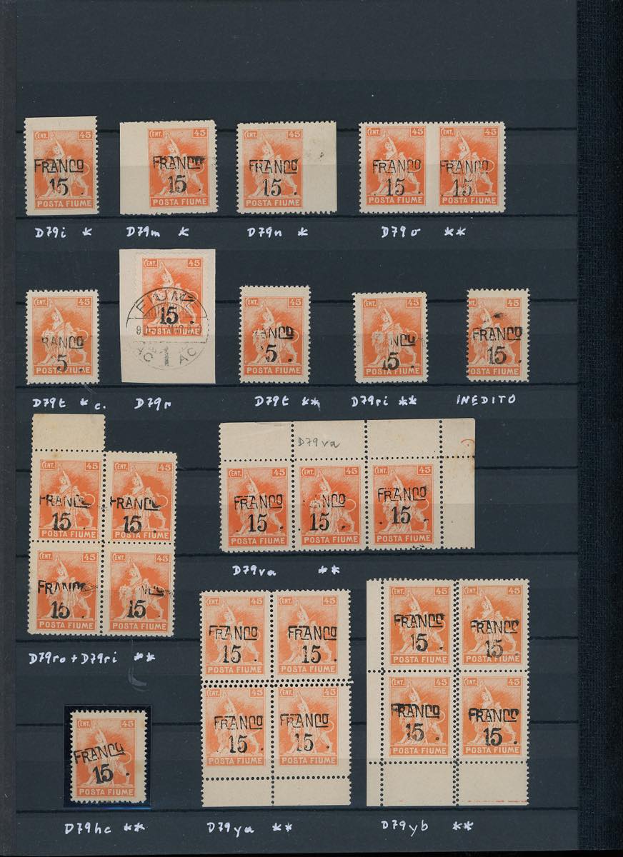 FIUME 1919 - Collezione di francobolli nuovi ed usati, relativi alla serie Allegorie e Vedute con dicitura "Posta Fiume", soprastampati e non, e alla serie Allegorie e Vedute con dicitura "Fiume" soprastampati "FRANCO", in pagine d'album con le relative classifiche. Presenti moltissime varietà anche di pregio e rare, alcune non catalogate. Diversi esemplari firmati da periti attendibili. Insieme irripetibile.