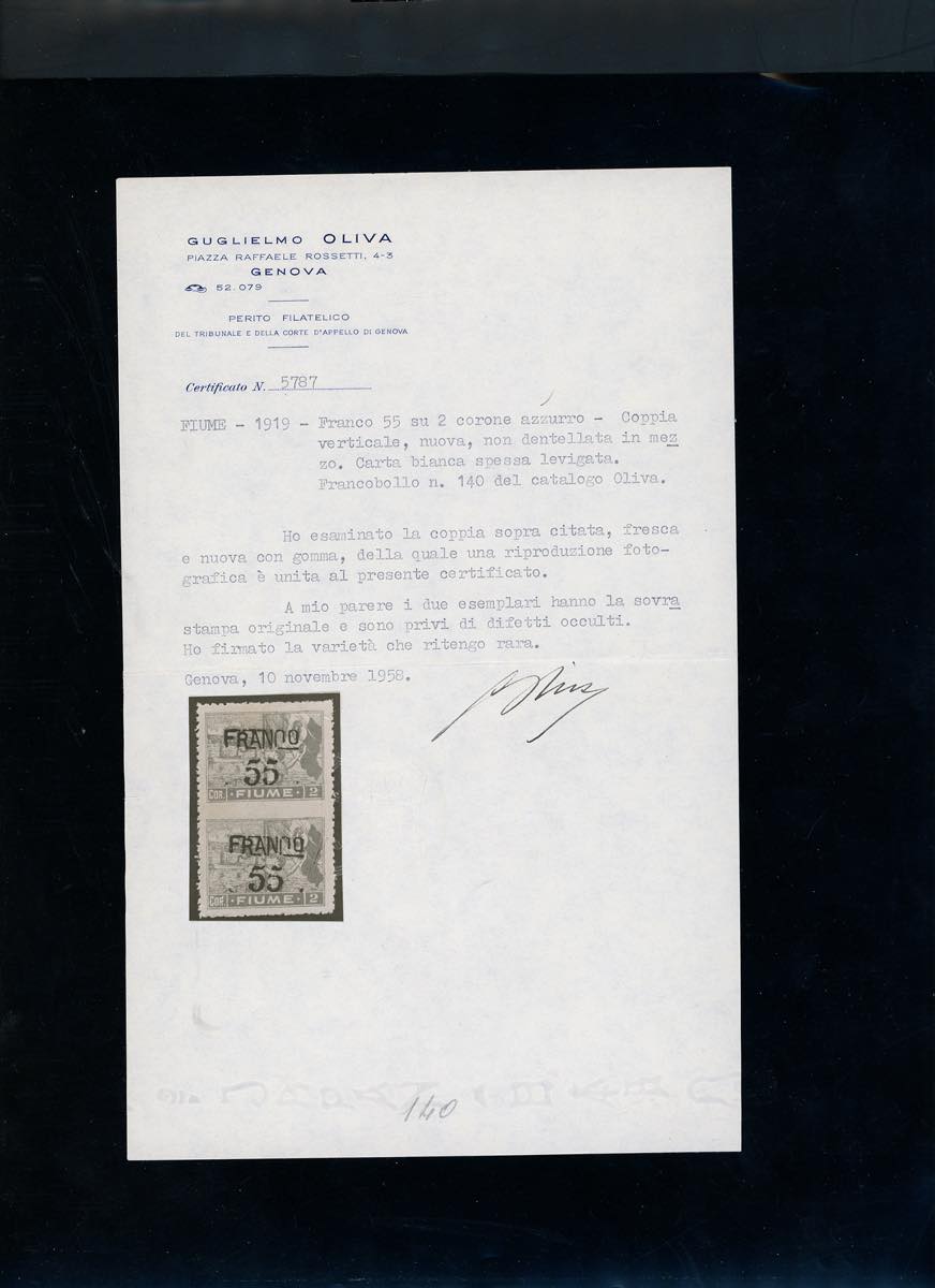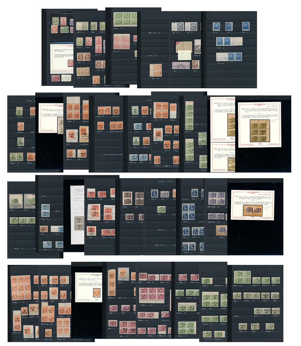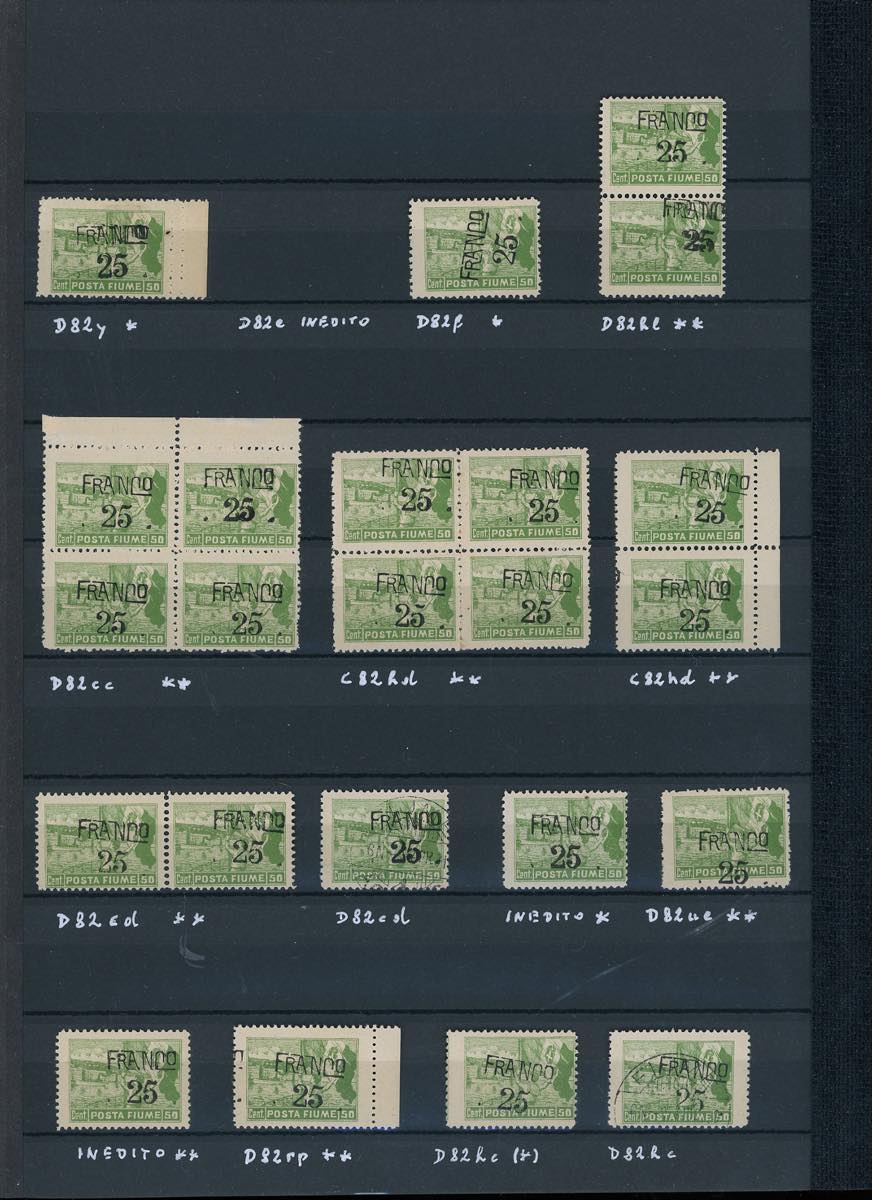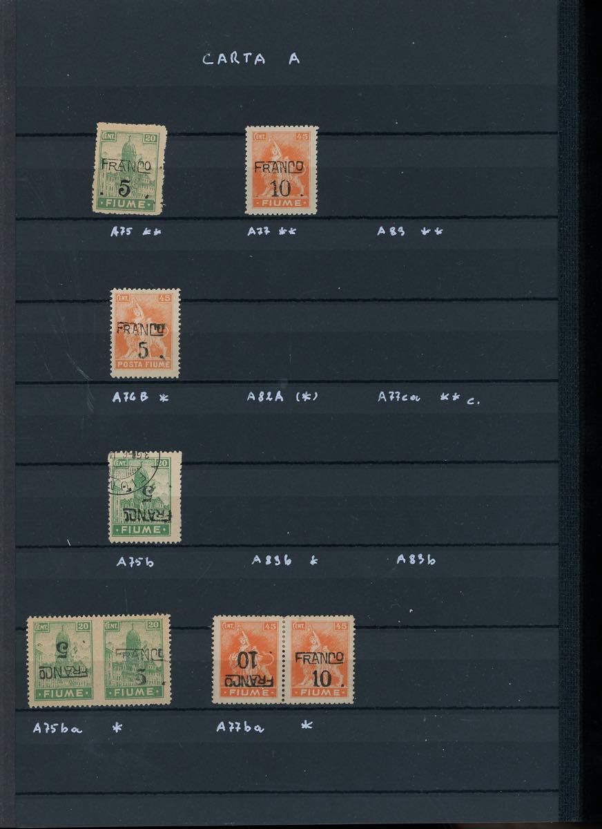 FIUME 1919 - Collezione di francobolli nuovi ed usati, relativi alla serie Allegorie e Vedute con dicitura "Posta Fiume", soprastampati e non, e alla serie Allegorie e Vedute con dicitura "Fiume" soprastampati "FRANCO", in pagine d'album con le relative classifiche. Presenti moltissime varietà anche di pregio e rare, alcune non catalogate. Diversi esemplari firmati da periti attendibili. Insieme irripetibile.