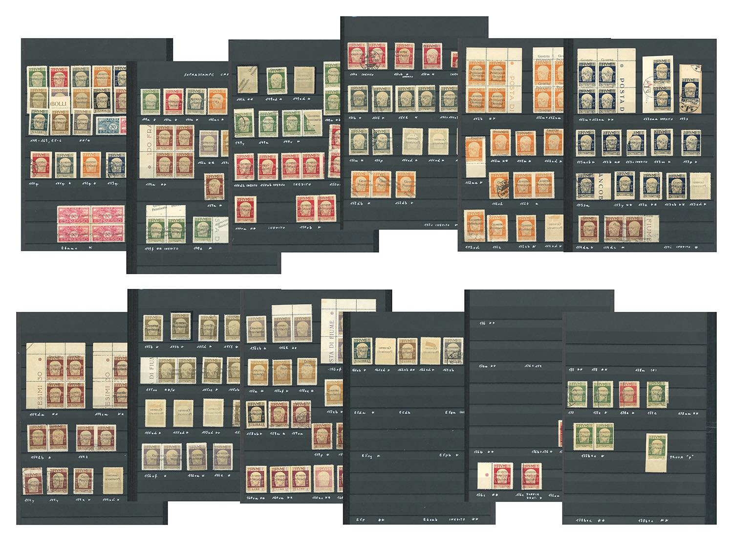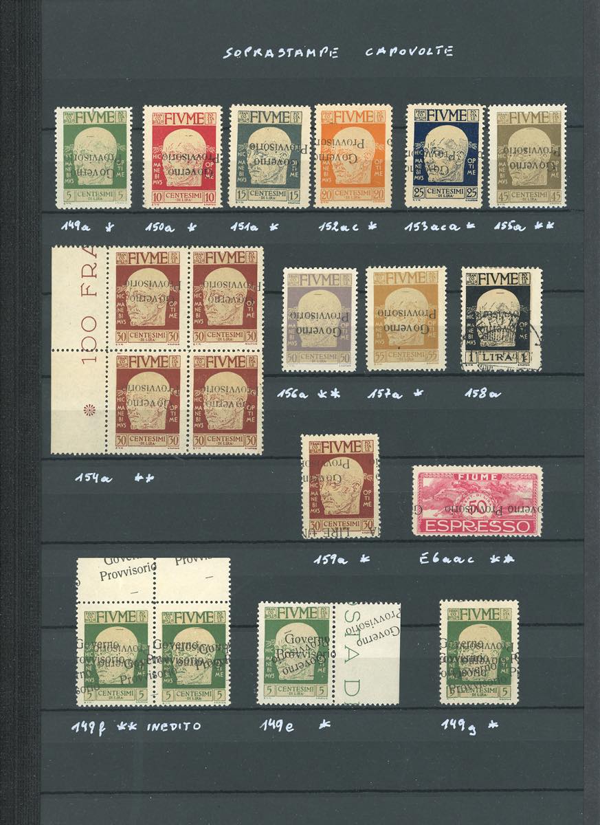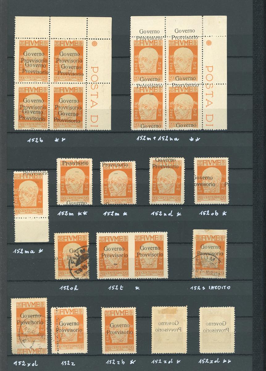 FIUME 1921 - Collezione di francobolli nuovi ed usati, relativi alla serie D'Annunzio soprastampati "Governo Provvisorio" (149/163+E, 176/178), in pagine d'album con le relative classifiche. Presenti moltissime varietà anche di pregio e rare, alcune non catalogate. Diversi esemplari firmati da periti attendibili. Insieme irripetibile.