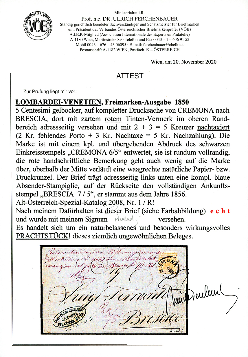 1856 - 5 cent. giallo ocra (1), perfetto, isolato su circolare a stampa a Cremona 6/5/1856 a Brescia. Sul fronte manoscritto "Per la contravvenzione di finanza in causa dell'intrusione di scritti venne stesa la descrizione del fatto in Brescia" e la lettera venne tassata 5 carantani: 2 kr. per il porto mancante, 3 kr. di soprattassa. Estremamente rari gli stampati tassati per il contenuto non ammesso. Da esposizione! Ferrario cert. Ferchenbauer.