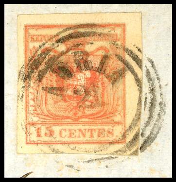 1856 - 20 cent. rosso vermiglio, III tipo, carta a macchina, stampa oleosa, dovuta probabilmente alla gommatura del foglio quando l'inchiostro di stampa non era ancora asciutto (20), perfetto, su lettera da Adria 21/12/1856 a Venezia. Varietà molto rara, per specialista. Dettagliato cert. A.Diena.