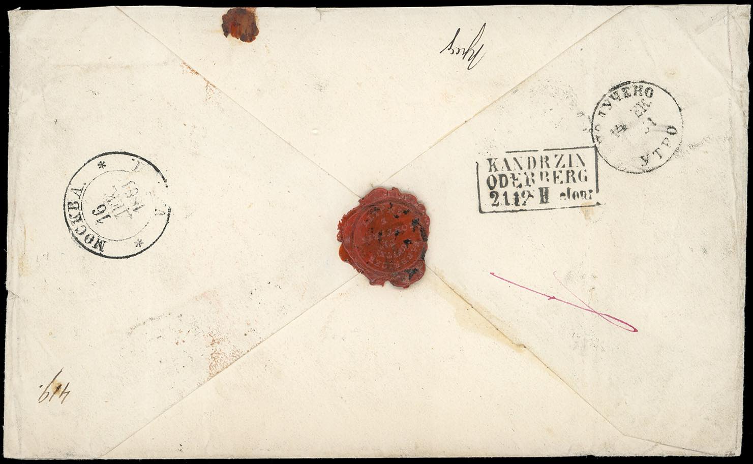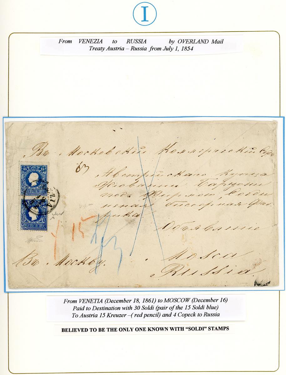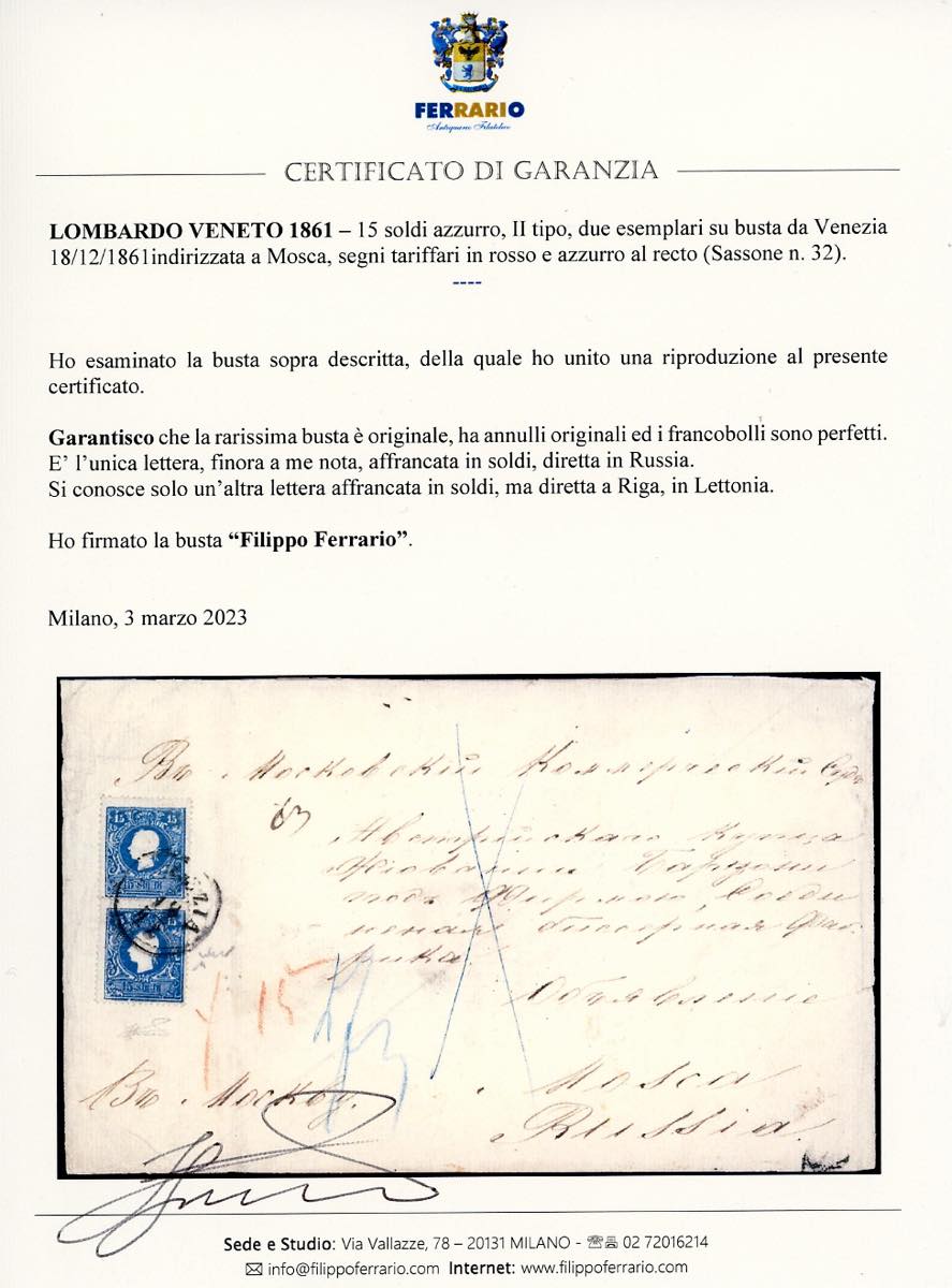 1861 - 15 soldi azzurro, II tipo (32), due esemplari perfetti, su busta da Venezia 18/12/1861 a Mosca, segni tariffari in rosso e azzurro sul fronte. UNICA LETTERA NOTA CON AFFRANCATURA IN SOLDI DIRETTA IN RUSSIA, se ne conosce solo un'altra diretta a Riga in Lettonia. Da esposizione! Chiavarello, cert. Ferrario. Ex coll. Imperato.