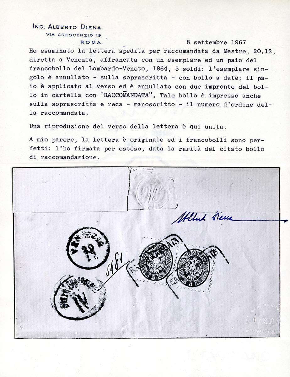 MESTRE, RACC punti 12 - 5 soldi (43), tre esemplari di cui due al verso, perfetti, su fresca raccomandata da Mestre 20/12/(1864?) a Venezia. Insieme molto bello e raro. Cert. A.Diena.