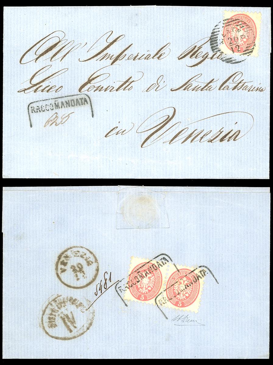 MESTRE, RACC punti 12 - 5 soldi (43), tre esemplari di cui due al verso, perfetti, su fresca raccomandata da Mestre 20/12/(1864?) a ... Leggi tutto