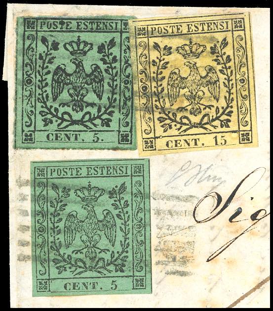 1854 - 5 cent. verde, un esemplare senza punto e uno con punto dopo le cifre, 15 cent. giallo (1,7,3), perfetti, su sovracoperta di lettera ... Leggi tutto