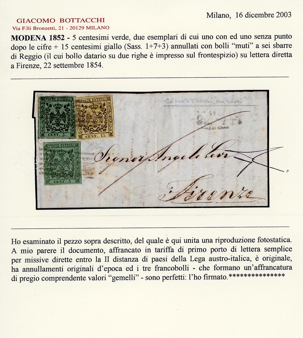 1854 - 5 cent. verde, un esemplare senza punto e uno con punto dopo le cifre, 15 cent. giallo (1,7,3), perfetti, su sovracoperta di lettera da Reggio 22/9/1854 a Firenze. RARISSIMA COMBINAZIONE DI VALORI GEMELLI! G.Oliva, cert. Bottacchi.