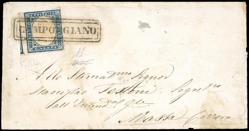 CAMPORGIANO, cartella punti R2 - 20 cent. IV emissione di Sardegna (15Cb), giusto in alto, su busta per Massa Carrara, bollo di arrivo del 2/12/1860. Rara. A.Diena, cert. Ferrario.