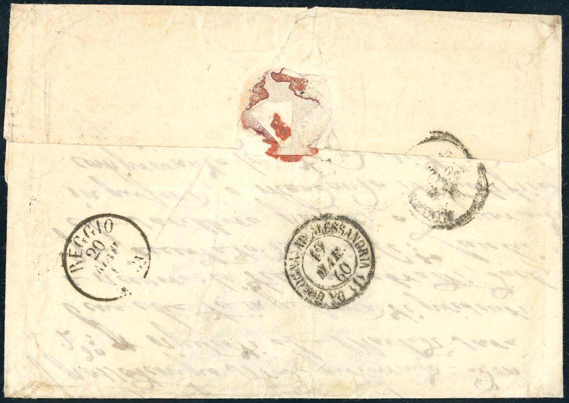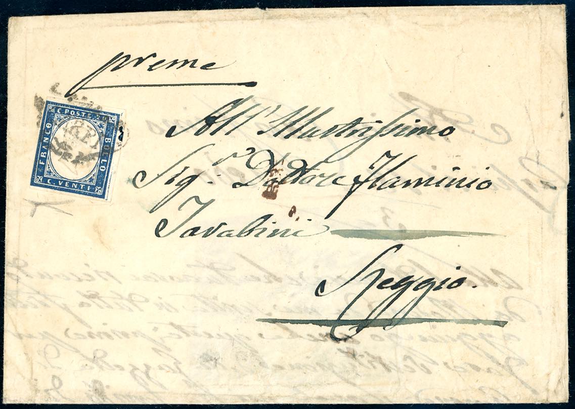 CARPI, a cuore punti R1 - 20 cent. azzurro scurissimo (Sardegna 15C), ottimo stato, su lettera del 18/3/1860 per Reggio. Interessante e ... Leggi tutto
