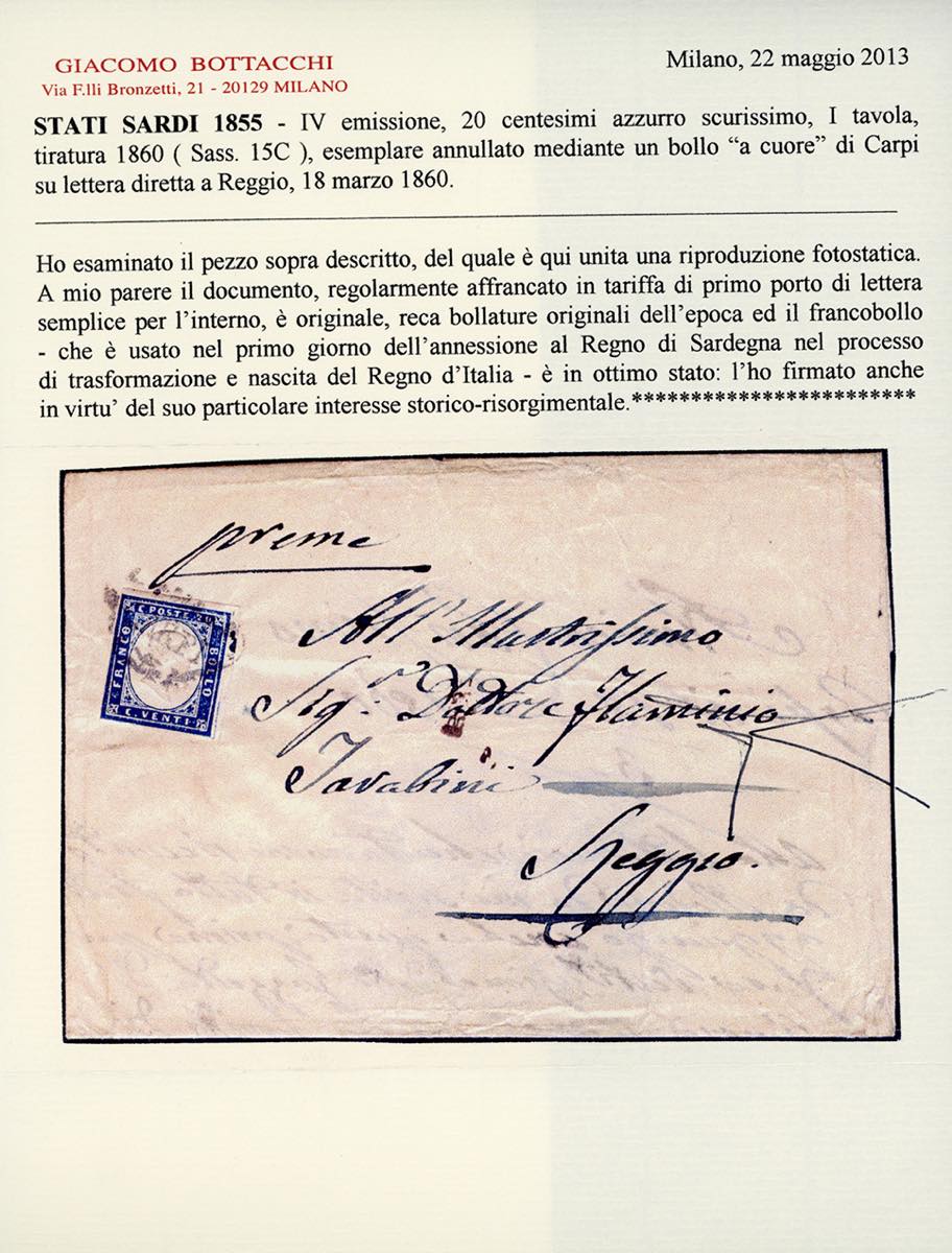 CARPI, a cuore punti R1 - 20 cent. azzurro scurissimo (Sardegna 15C), ottimo stato, su lettera del 18/3/1860 per Reggio. Interessante e rara lettera risalente all'ULTIMO GIORNO del Governo Provvisorio. Cert. Bottacchi.
