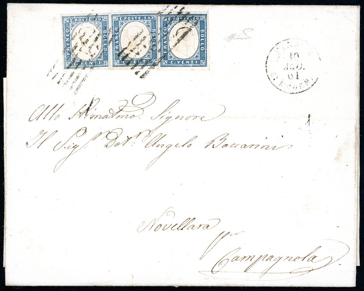 FINALE DI MODENA, 6 sbarre + sardo italiano - 20 cent. celestre grigiastro IV emissione di Sardegna (15Dg), tre esemplari con differenti inchiostrazioni, perfetti, su fresca lettera di tre porti del 10/8/1861 per Campagnola. Bella. Ferrario.