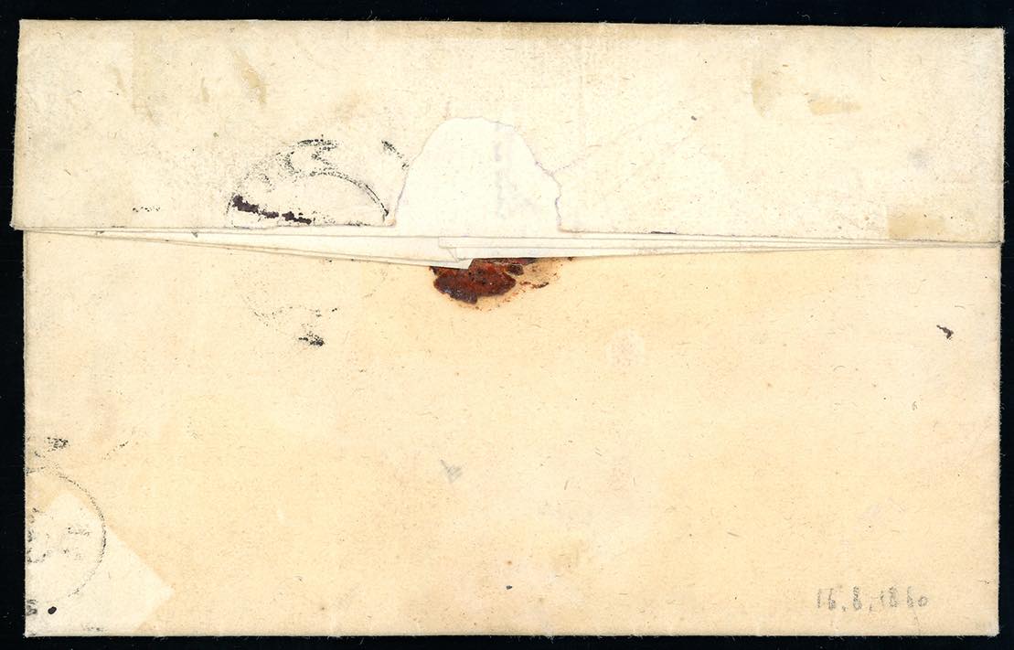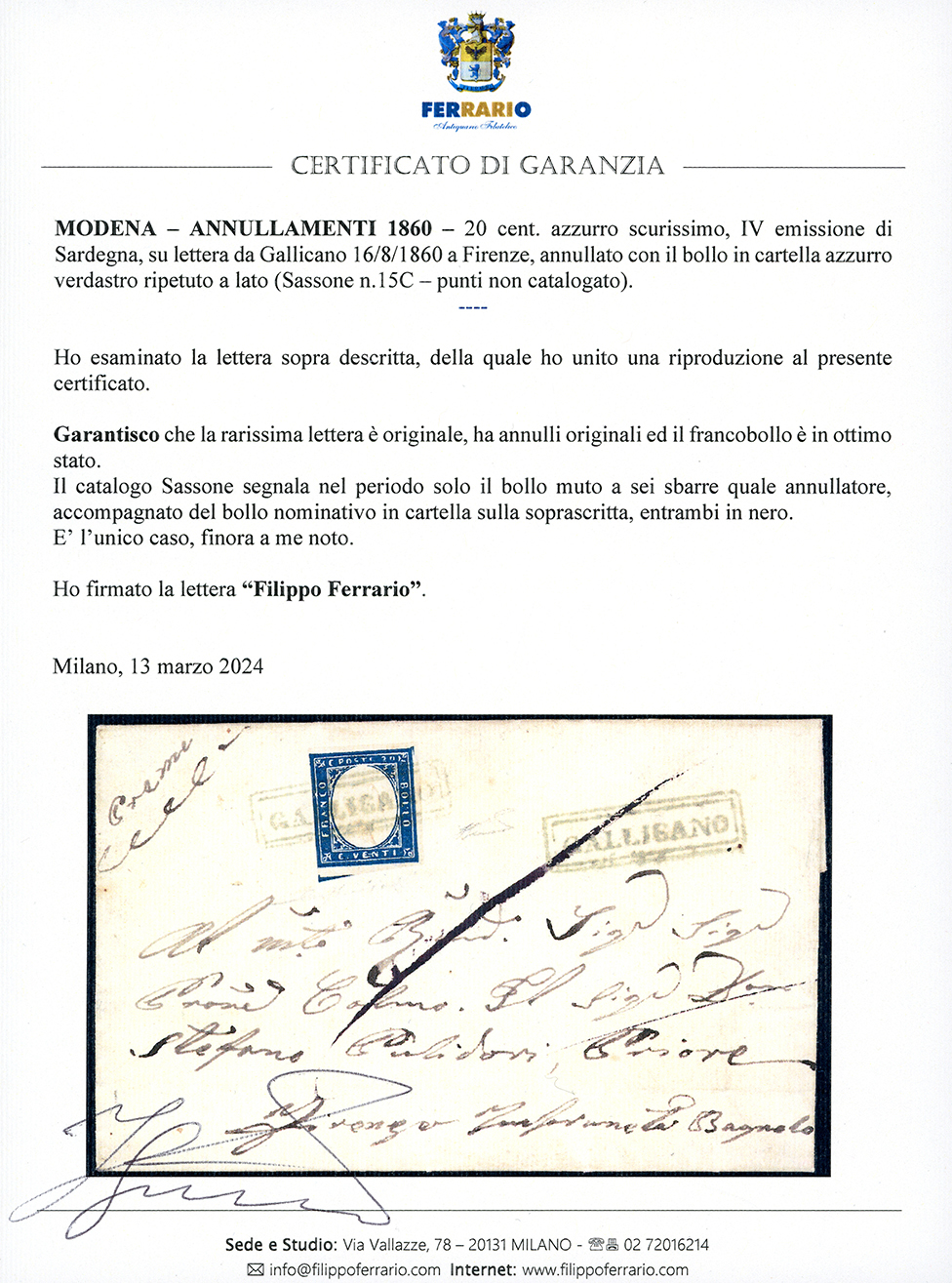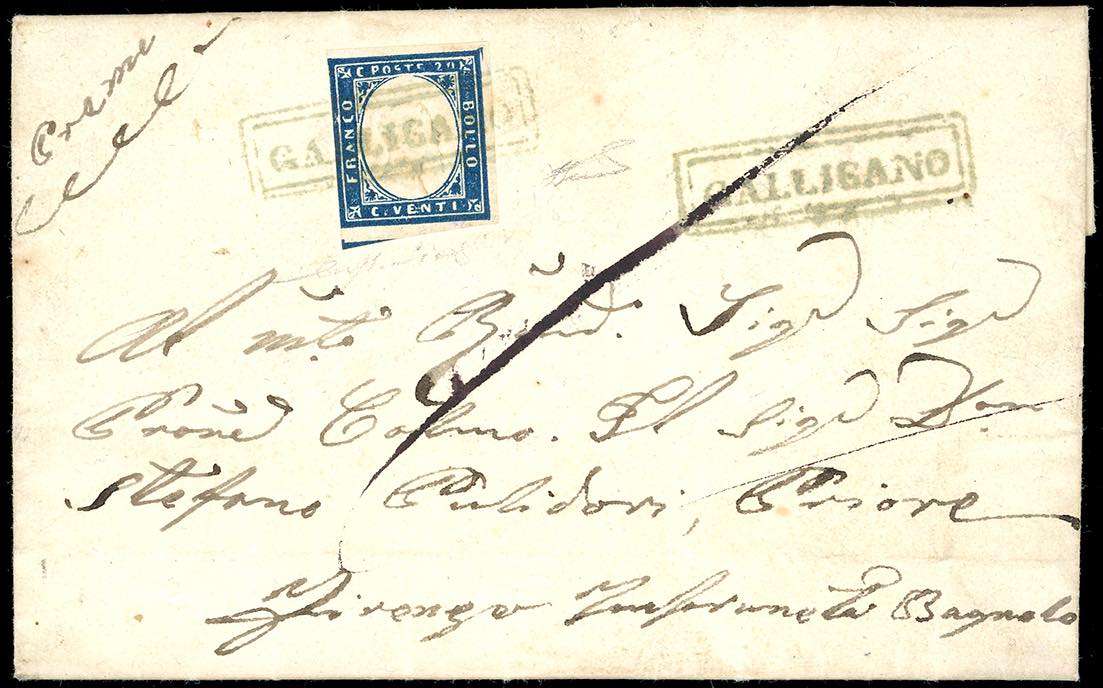 GALLICANO, cartella in azzurro verdastro, non catalogato - 20 cent. IV emissione di Sardegna (15C), giusto a sinistra, su lettera del 16/8/1860 a Firenze. Il cat. Sassone segnala nel periodo solo il muto a sei sbarre quale annullatore, accompagnato del bollo nominativo in cartella, entrambi in nero. Insieme INEDITO ED UNICO. Rarità del settore, per specialista. Fiecchi, cert. Ferrario.