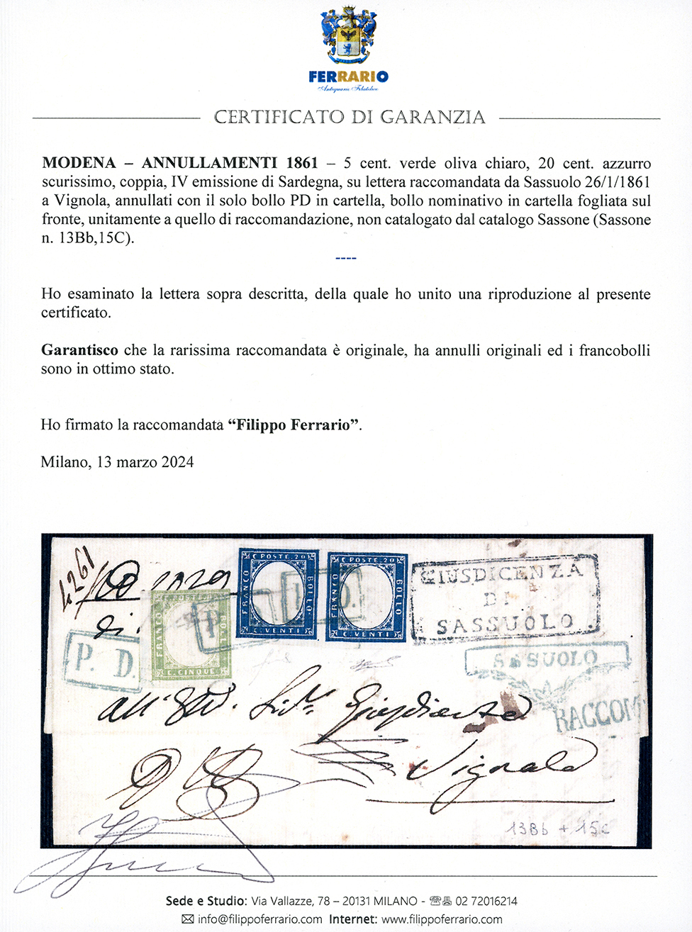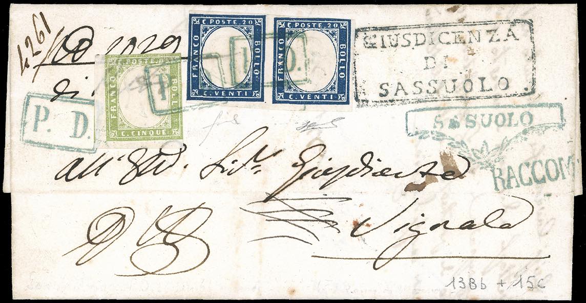SASSUOLO, PD unico annullatore + cartella sagomata + RACCOM, non catalogato - 5 cent. verde oliva chiaro, 20 cent. azzurro scurissimo, coppia, IV emissione di Sardegna (13Bb,15C), qualche margine rasente su fresca lettera raccomandata del 26/1/1861 per Vignola. Il bollo di raccomandazione di Sassuolo non è segnalato dal catalogo Sassone per questo ufficio. Rarità inedita per specialista. Fiecchi, cert. Ferrario.