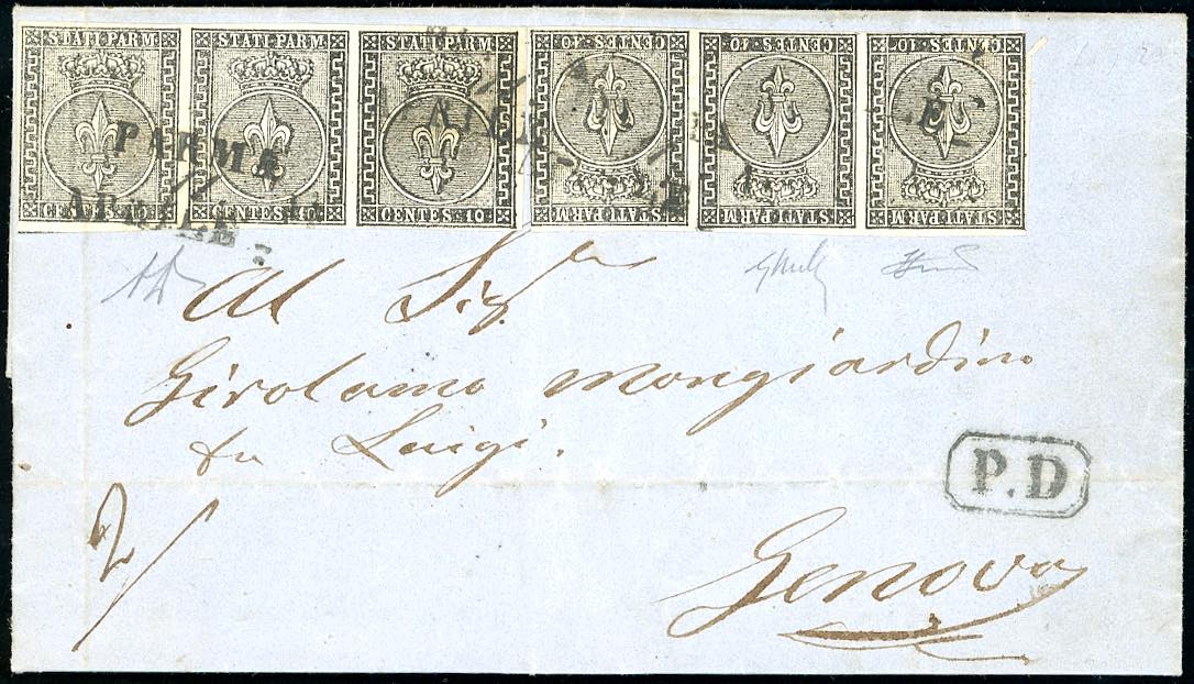 1855 - 10 cent. bianco (2), due strisce di tre, la prima, ben marginata e perfetta, applicata su una piega preesistente della lettera, la seconda con margini da completi a giusti, su lettera di doppio porto da Parma 11/4/1855 a Genova. Rarissima affrancatura multipla monovalore di cui si conoscono pochissimi casi. A.Diena, Chiavarello, cert. Ferrario.