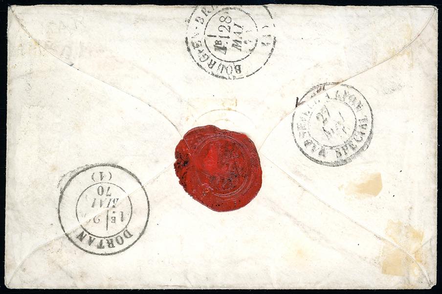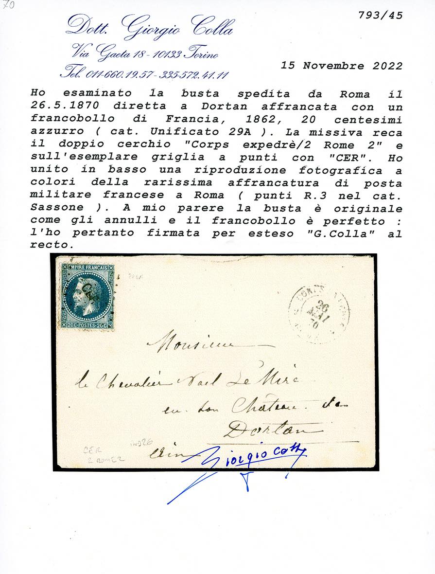 1870 - 20 cent. Napoleone laureato (29A), ottimo stato, su busta inviata dal Corpo di Spedizione a Roma 26/5/1870, griglia a punti con CER annullatore (punti R3), a Dortan. Rara testimonianza della presenza della posta militare francese nello Stato Pontificio nell'anno della presa di Roma. Ferrario, cert. Colla.(Cat.Sassone € 35.000/52.500).