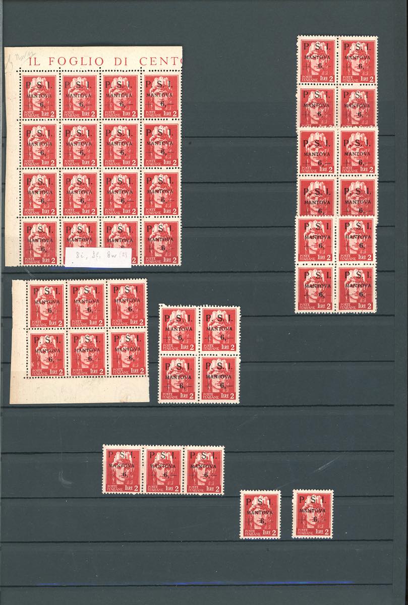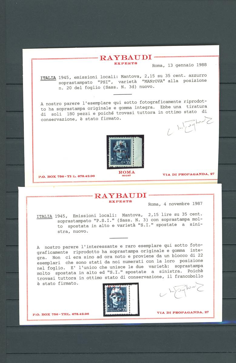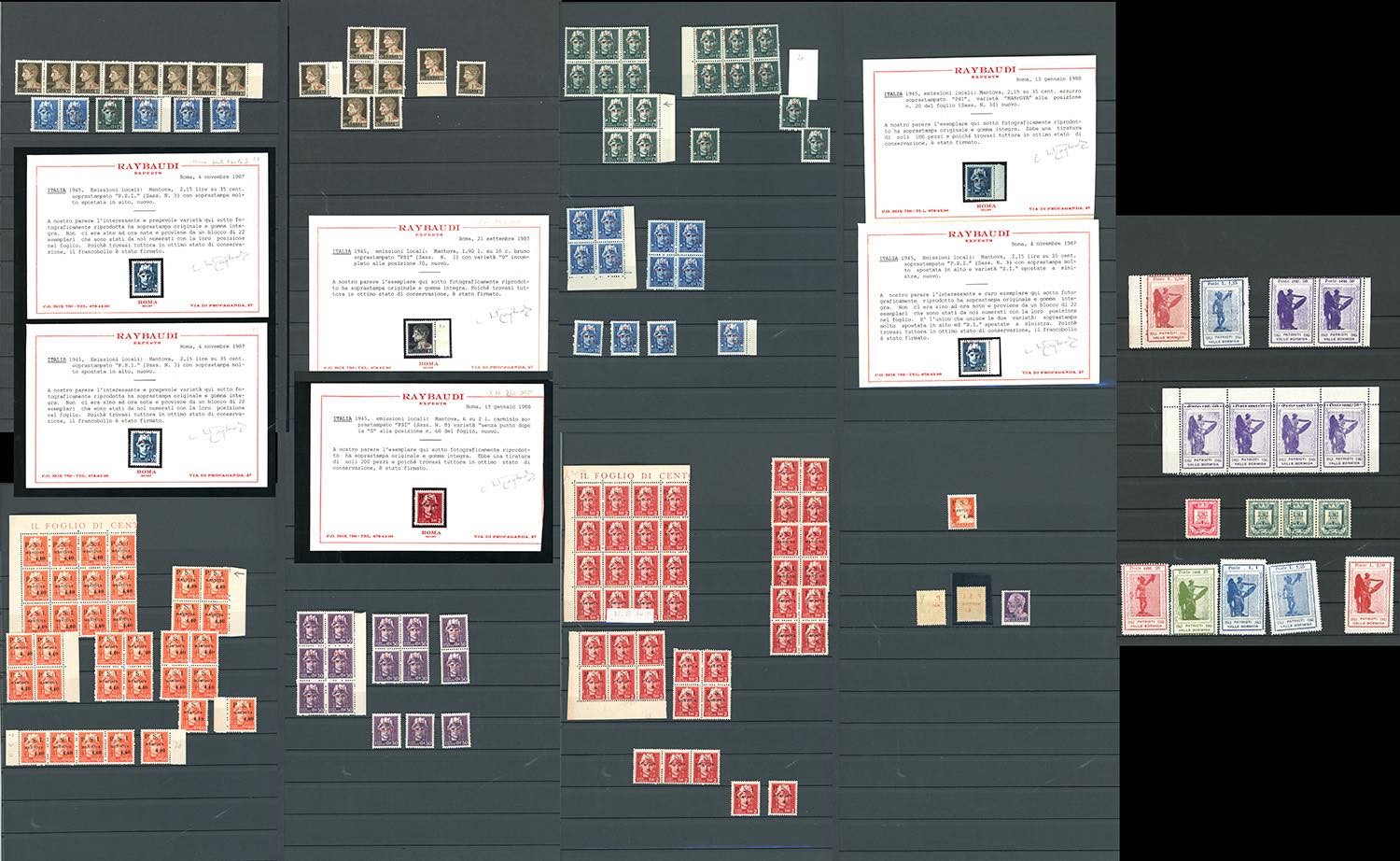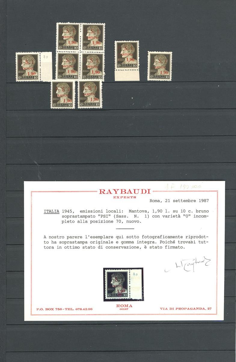 C.L.N. MANTOVA 1945 - Collezione specializzata e molto avanzata sull'emissione soprastampata, con numerose varietà di soprastampa, anche rare. Notati 6 certificati Raybaudi. E' presente una piccola appendice sull'emissione della Valle Bormida. Elevato valore di catalogo, raro insieme, ottimo sia per specialista che per dettaglio.