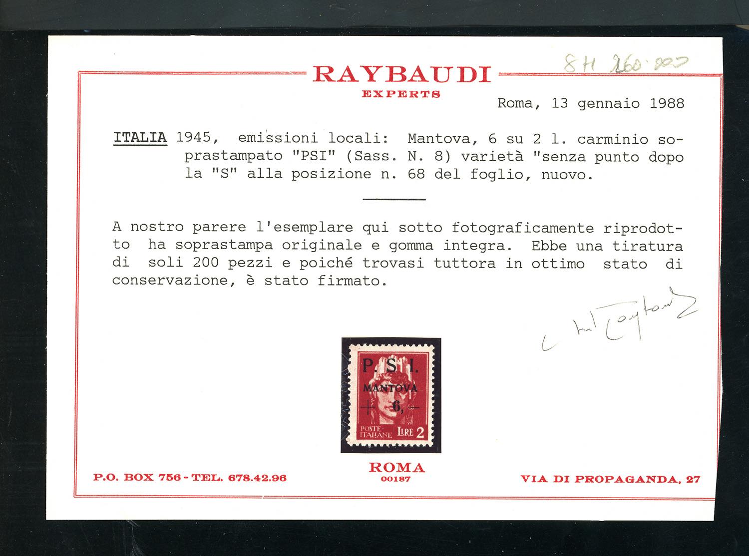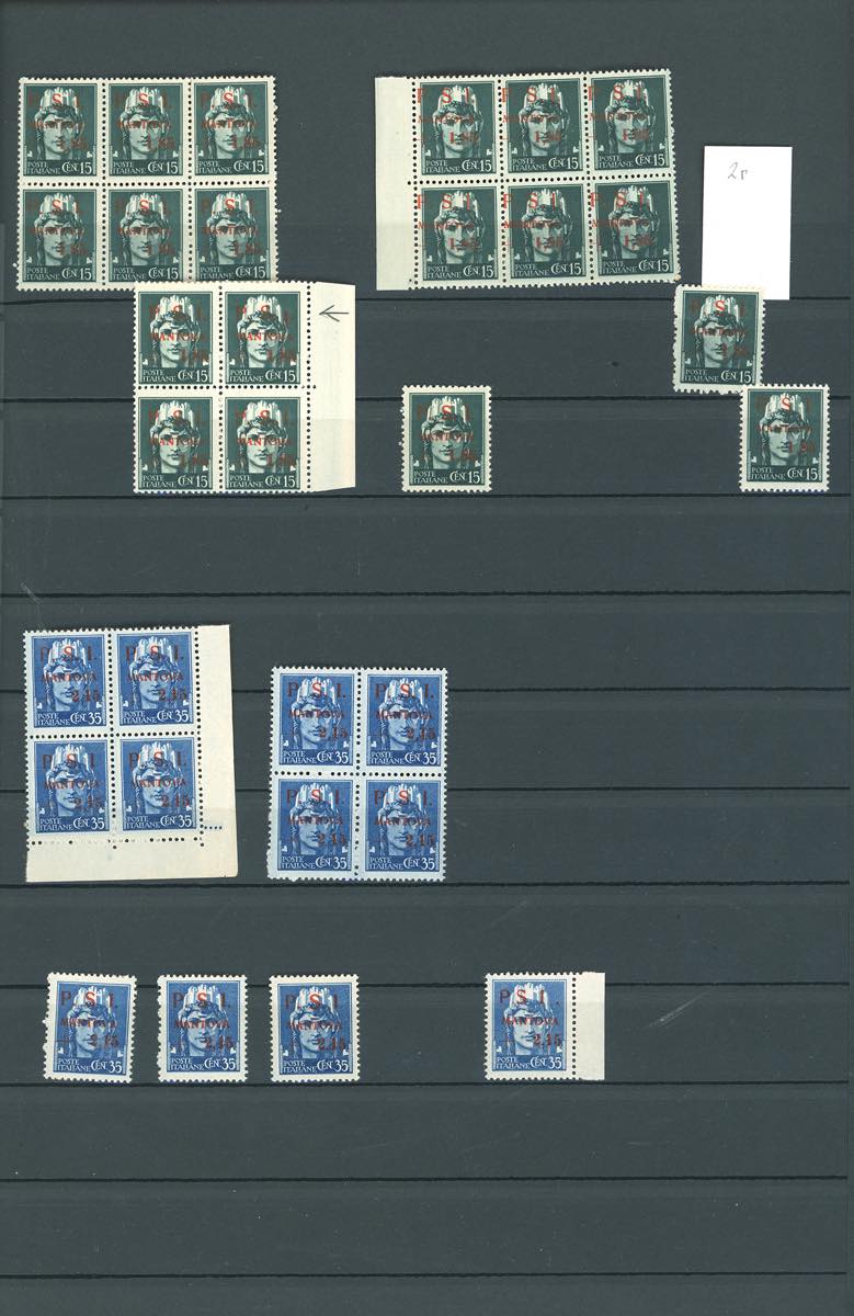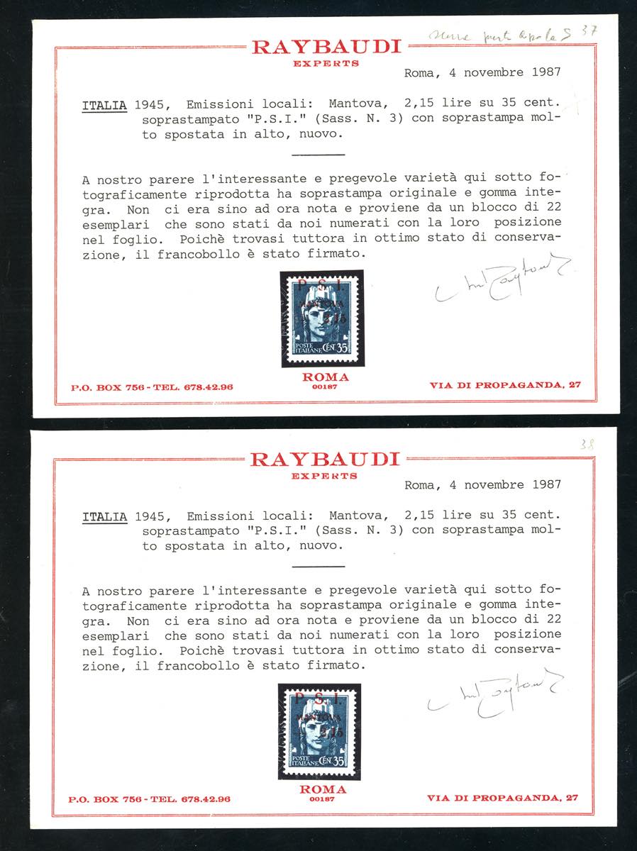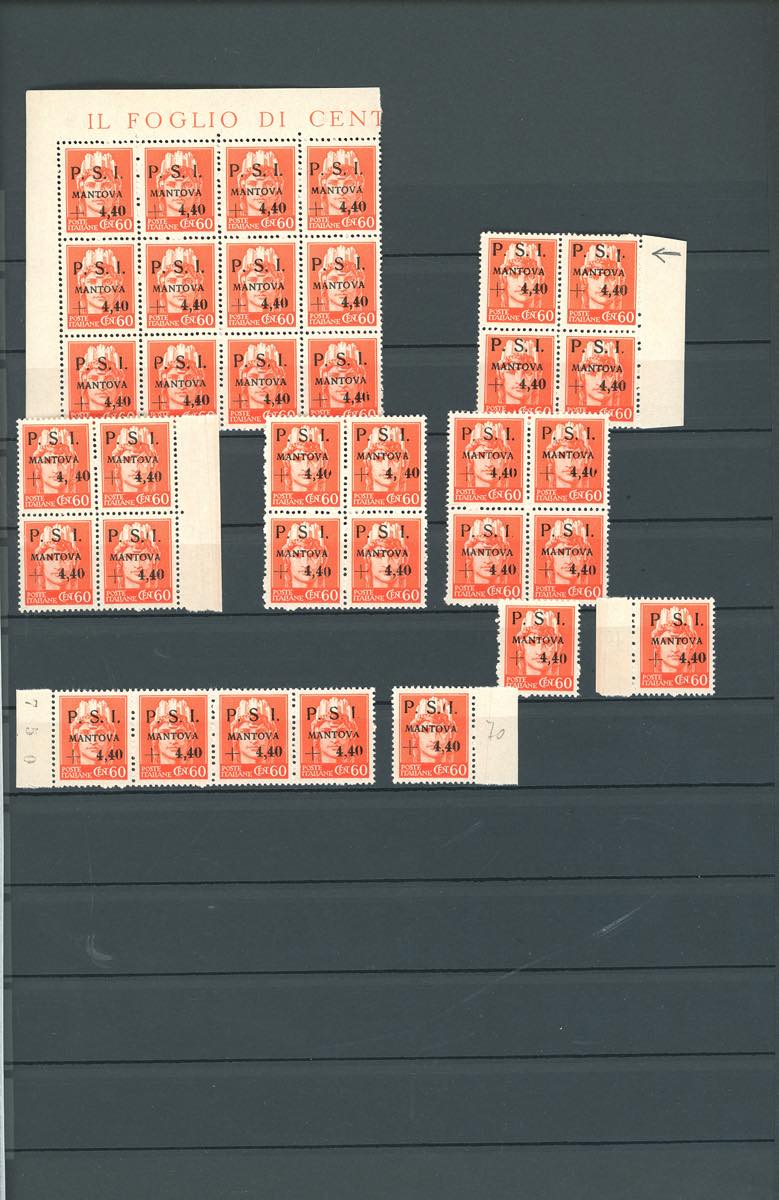 C.L.N. MANTOVA 1945 - Collezione specializzata e molto avanzata sull'emissione soprastampata, con numerose varietà di soprastampa, anche rare. Notati 6 certificati Raybaudi. E' presente una piccola appendice sull'emissione della Valle Bormida. Elevato valore di catalogo, raro insieme, ottimo sia per specialista che per dettaglio.