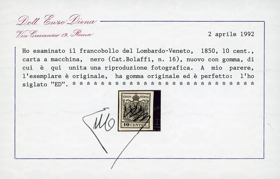 1857 - 10 cent. nero, carta a macchina (19), nuovo, gomma originale, perfetto. Splendido per freschezza e marginatura. Molto raro di questa qualità. Emilio Diena, cert. E.Diena 1992.