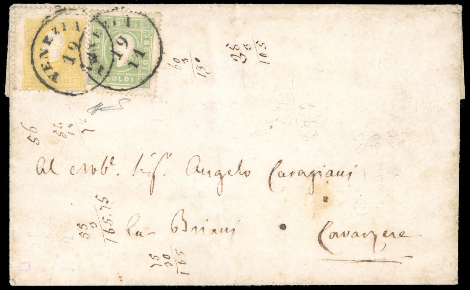 1862 - 2 soldi giallo, II tipo, 3 soldi verde (28,35), perfetti, su sovrastampa di lettera da Venezia 19/11 a Cavarzere. Ferrario.
