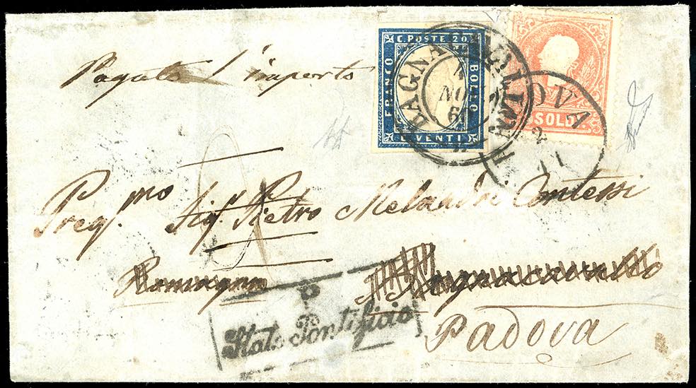 1860 - 5 soldi, II tipo (30a), leggermente difettoso in alto, su lettera da Padova 2/11/1860 a Bagnacavallo, tassata 20 centesimi, in seguito cassati, in aggiunta dicitura manoscritta "pagato l'importo". Da Bagnacavallo venne riaffrancata con 20 cent. di Sardegna (15C), perfetto, il 4/11/1860 e rispedita a Padova, con l'aggiunta del bollo "P-Stato Pontificio". Bella e rara affrancatura mista di rispedizione. Da esposizione! A.Diena, Ferrario, cert. Bottacchi. Ex coll. Imperato.