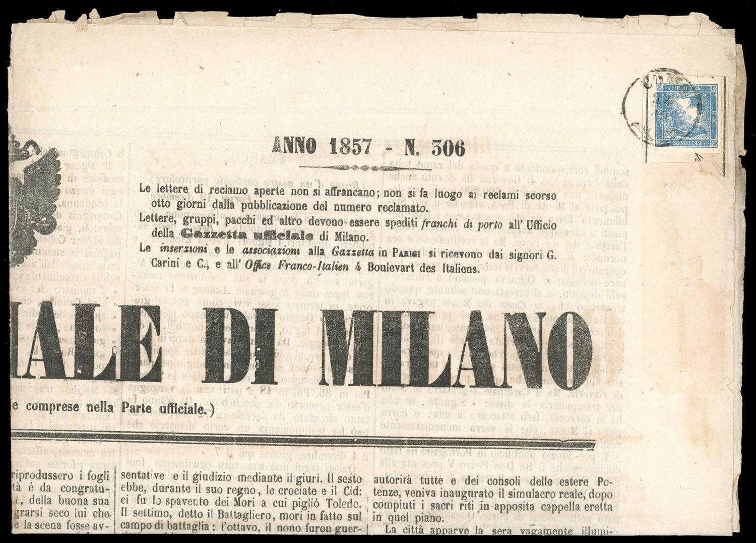 1857 - 3 cent. Mercurio, III tipo (3), appena sfiorato, usato su giornale con annullo di Como 24/10/1857.