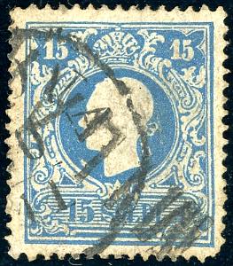 MILANO SD senza data, punti R1 - 15 soldi azzurro, I tipo (27), lieve punto d'assotigliamento al verso, usato con coannullatore di Padova 10/11/1858, da ricevuta di ritorno. Raro. Ferrario.