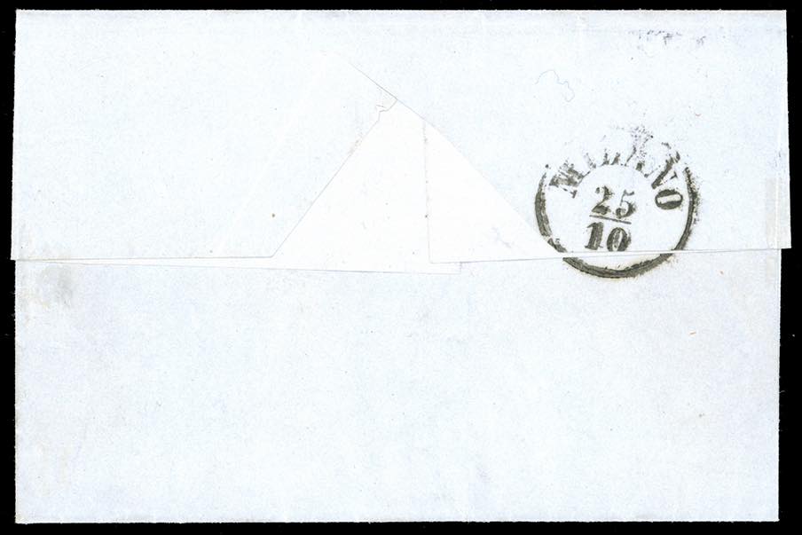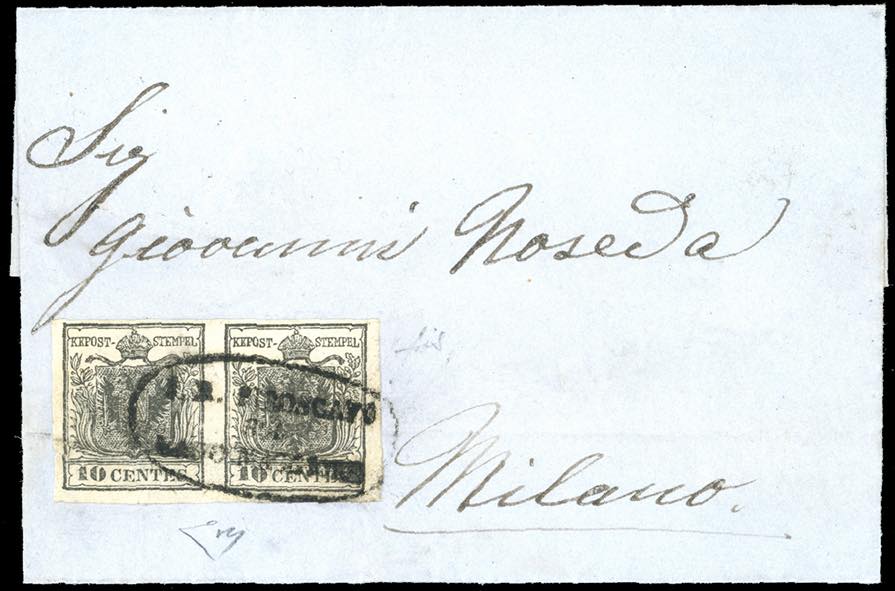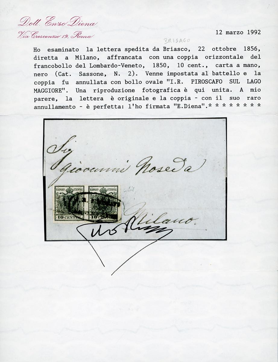 PIROSCAFO SUL LAGO MAGGIORE, punti 12 - 10 cent. nero, carta a mano (2), coppia orizzontale, perfetto, su fresca lettera scritta a Brissago 22/10/1856, in Svizzera, ed impostata direttamente su un battello della linea del lago Maggiore, per Milano. Interessante e molto rara. Fiecchi, cert. E.Diena.