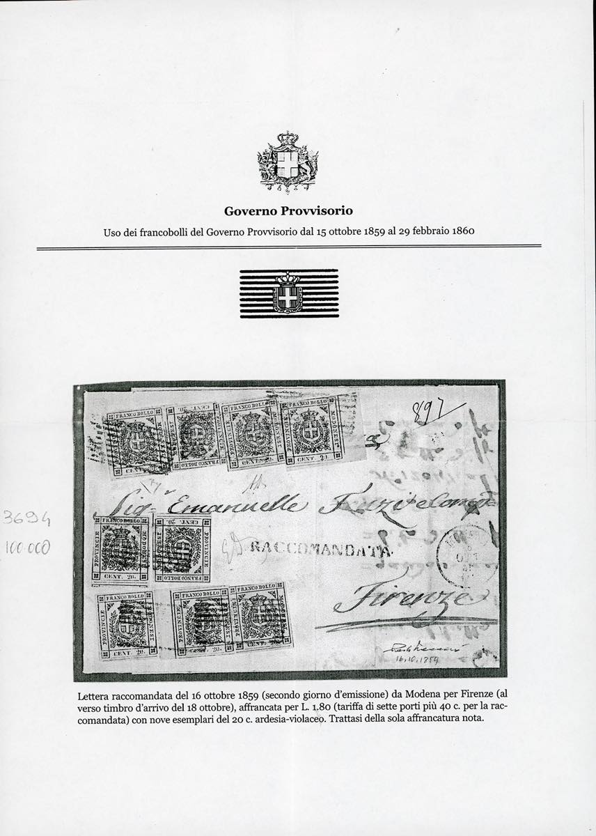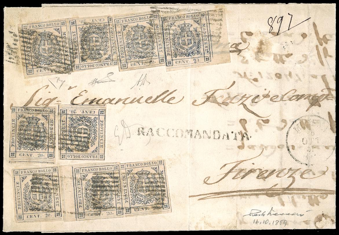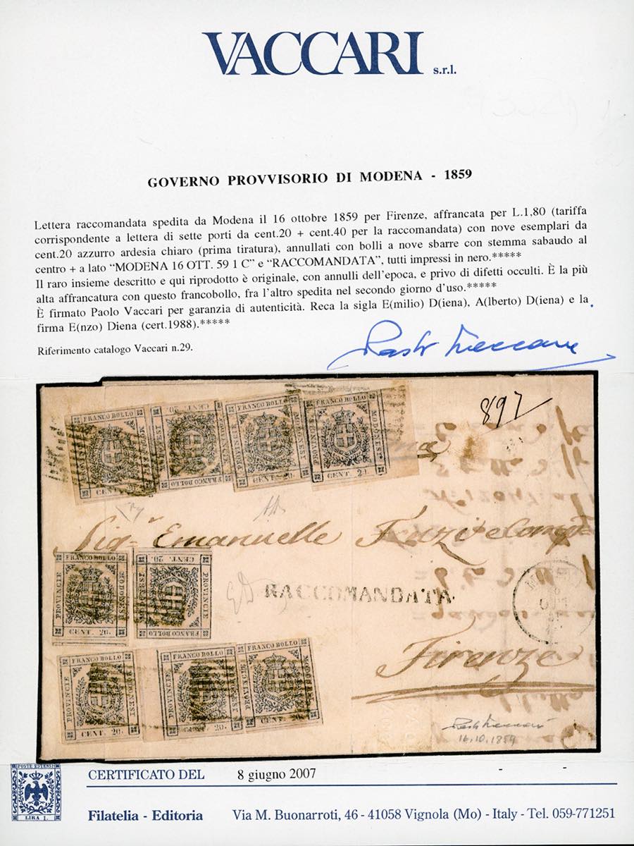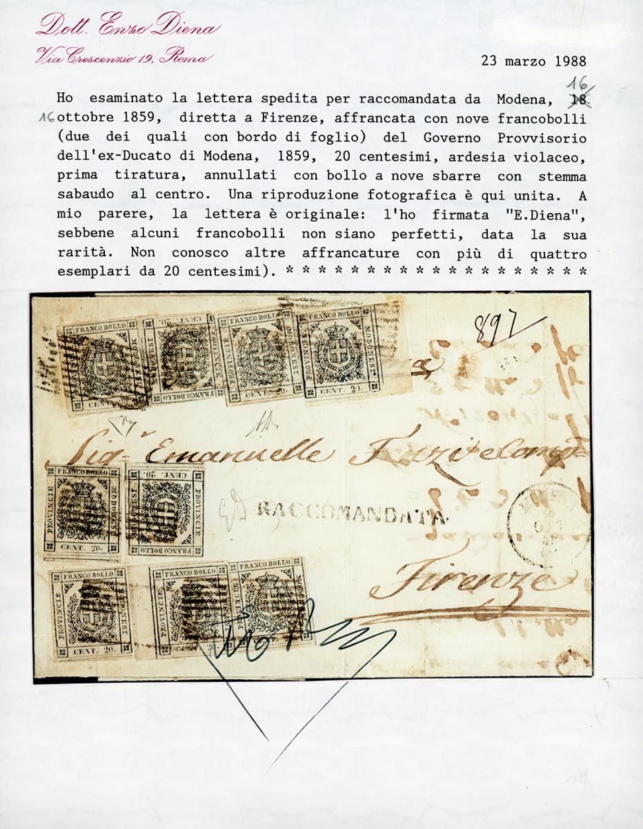 1859 - 20 cent. ardesia violaceo, prima tiratura (15), nove esemplari su raccomandata da Modena 18 ottobre 1859 a Firenze, nel secondo giorno d'emissione. Benchè alcuni francobolli presentino minimi difetti, si tratta di un'affrancatura spettacolare ed eccezionale. E' il massimo multiplo su lettera di questo francobollo, è la più alta affrancatura (lire 1,80) del Governo Provvisorio di Modena diretta in territorio italico ed è inoltre la lettera con il maggior numero di esemplari, nove, dell'emissione per il Governo Provvisorio di Modena. E' pubblicata a pag. 284 del libro specializzato "150°Anniversario dei Francobolli Estensi" edito da Vaccari nel 2002. Una delle più spettacolari affrancature multiple di tutti i Governi Provvisori. Da esposizione. Emilio ed Alberto Diena, cert. Enzo Diena, Ferrario e Vaccari.