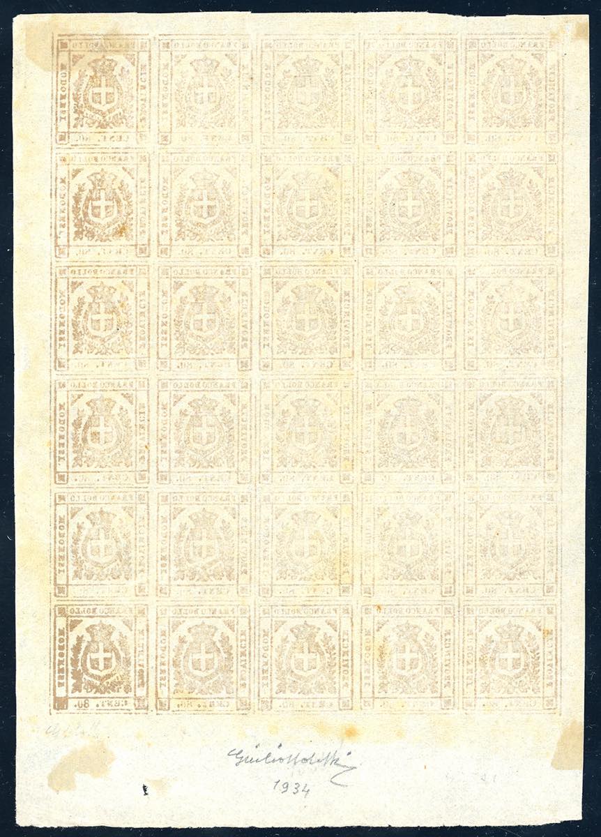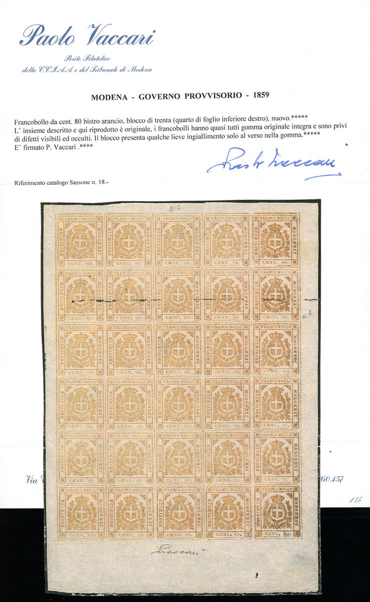 1859 - 80 cent. bistro arancio (18), blocco di trenta, quarto di foglio inferiore destro, nuovo, gomma originale integra, solo due ... Leggi tutto