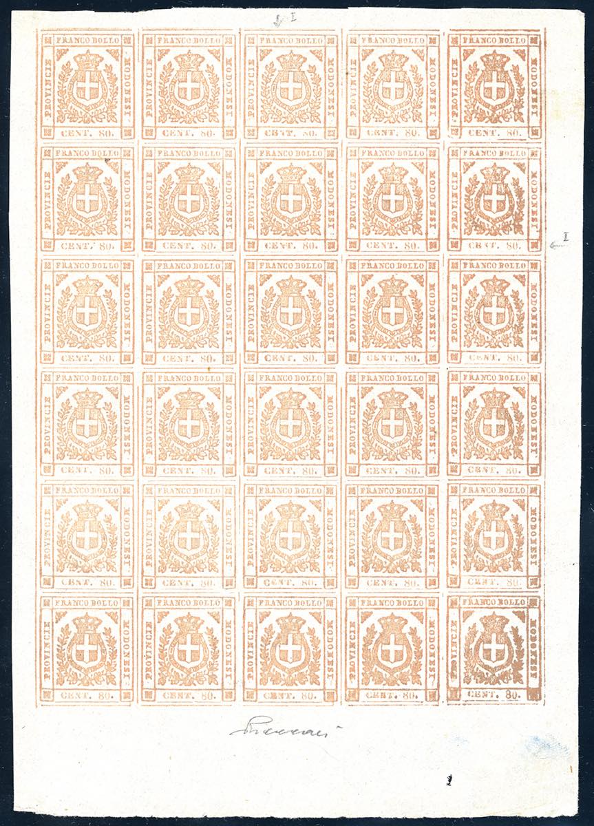 1859 - 80 cent. bistro arancio (18), blocco di trenta, quarto di foglio inferiore destro, nuovo, gomma originale integra, solo due esemplari con traccia di linguella, perfetto. Quattro esemplari con decalco ed altri con varietà non catalogate. Raro. Firmato Giulio Bolaffi per esteso, cert. Vaccari.