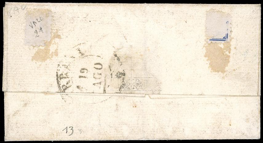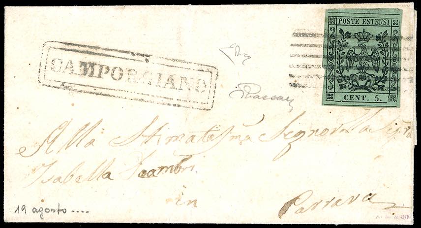 CAMPORGIANO, 6 sbarre + cartella neri punti R1 - 5 cent. verde oliva (8), perfetto, su lettera del 19/8 a Carrara. Molto rara, solo CINQUE ... Leggi tutto