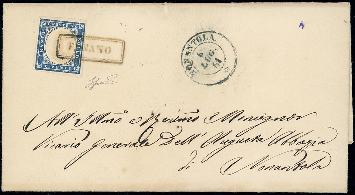 FANANO, cartella punti 13 - 20 cent. (Sardegna 15D), perfetto, su sovracoperta di lettera per Nonantola 6/7/1861. Splendida! Ferrario.