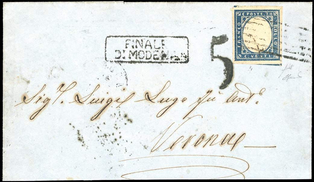 FINALE DI MODENA, 6 sbarre + cartella punti 8 - 20 cent. IV emissione di Sardegna (15C), perfetto, su lettera del 19/4/1861 a Verona, bollo ... Leggi tutto