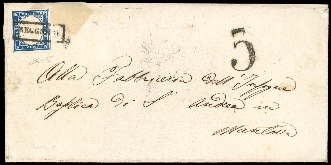 REGGIOLO, cartella punti 11 - 20 cent. IV emissione di Sardegna (15B), perfetto, su lettera per Mantova, bollo di tassa a tampone 5, al verso bollo di arrivo del 27/3/1860. Ferrario.