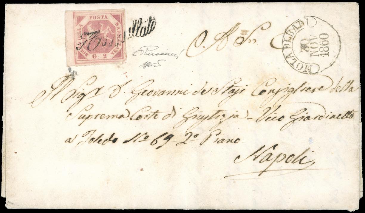 MOLA DI BARI, svolazzo e cerchio, punti 13 - 2 grana rosa carminio, I tavola (5d), perfetto, bordo di foglio, su fresca lettera del 30/11/1860 a Napoli, durante la Luogotenenza di Carlo Farini. Bella e rara. Vaccari, cert. Ferrario. Ex coll. Imperato.