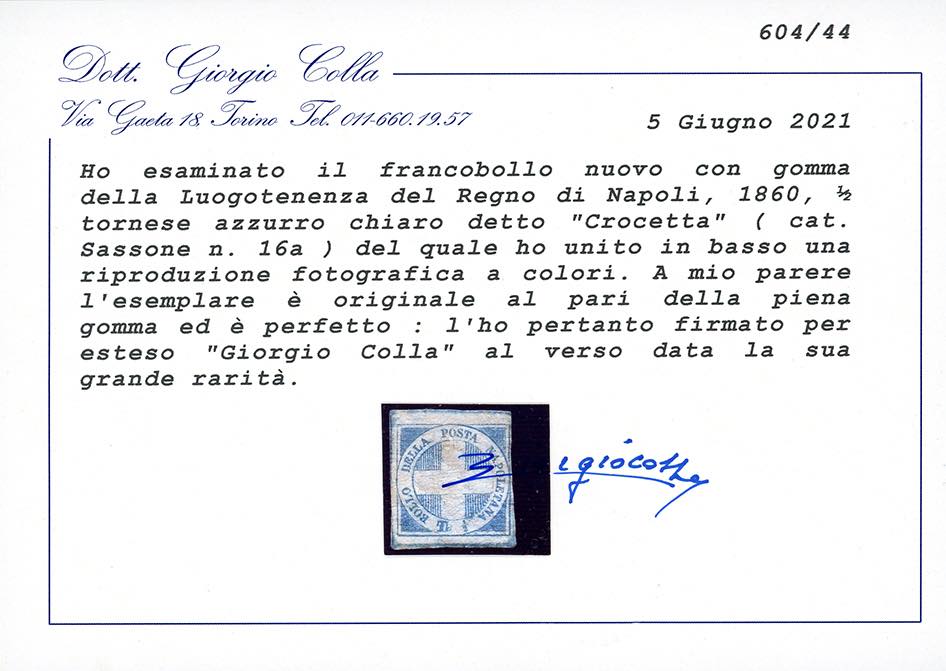 1860 - 1/2 tornese azzurro, chiaro, detto "Crocetta" (16a), nuovo, gomma originale, lieve traccia di linguella, perfetto. Molto fresco ed estremamente raro allo stato di nuovo. Cert. Colla.