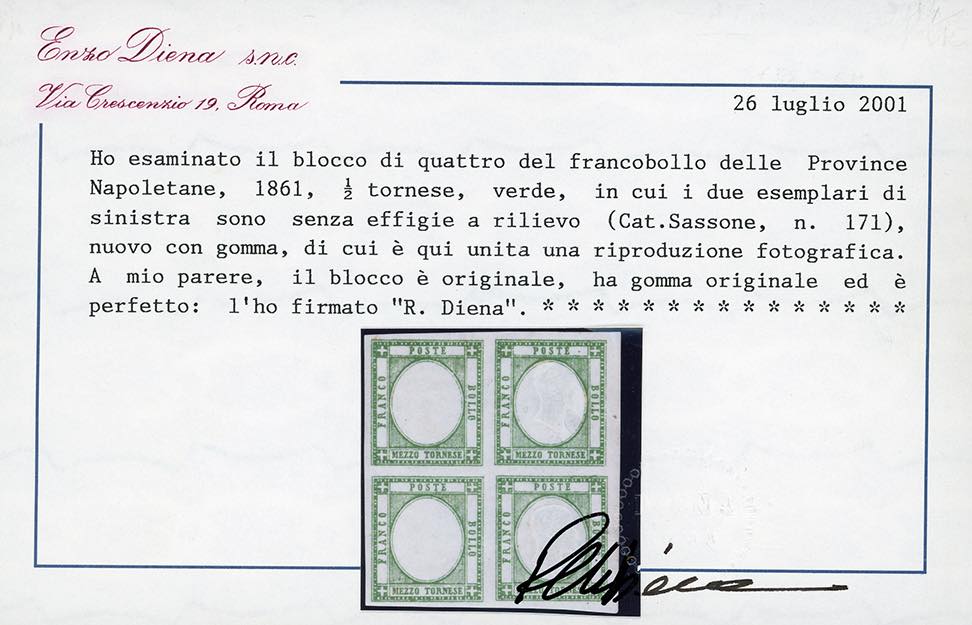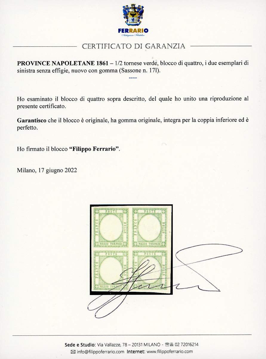 1861 - 1/2 tornese verde, blocco di quattro, i due esemplari di sinistra senza effigie (17l), gomma originale, integra per la coppia inferiore, perfetto. Raro. Cert. Diena e Ferrario.