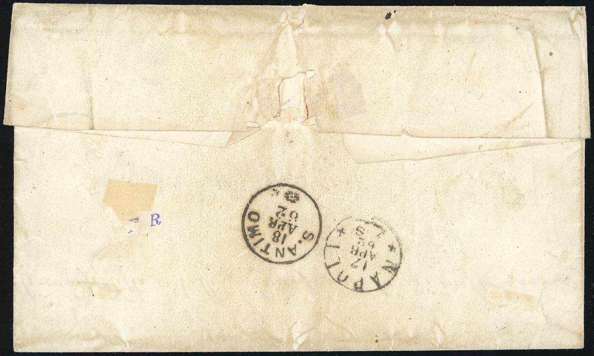 1862 - 1/2 grano grigio bruno (18a), quattro coppie orizzontali perfette, tranne un esemplare con ininfluente difetto in alto, su fresca sovracoperta di lettera da Chieti 16/4/1862 a S.Antimo, bolli d’arrivo. Eccezionale affrancatura multipla monovalore, il secondo massimo multiplo noto di questa tinta. Rarità. Stima di catalogo astronomica. Cert. Chiavarello, Ferrario.