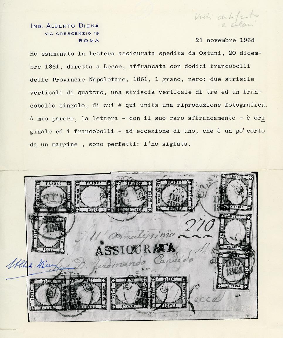 1861 - 1 grano nero intenso (19c), due strisce verticali di quattro, una di tre ed un singolo, tutti i francobolli perfetti e ben marginati ad eccezione di un solo esemplare leggermente corto a sinistra, su lettera assicurata da Ostuni 30/12/1861 a Lecce. Rarissima affrancatura multipla monovalore. Raybaudi, Chiavarello, cert. A. ed E.Diena. Ex coll. Imperato.