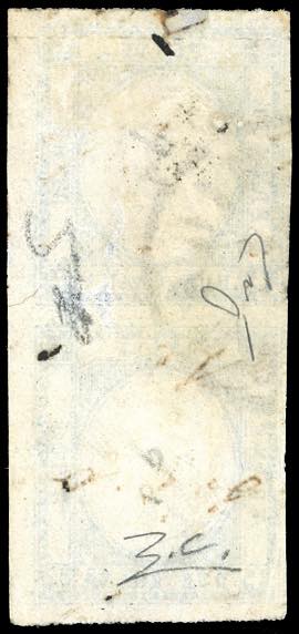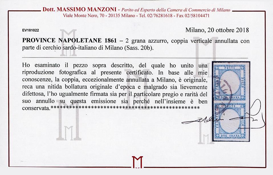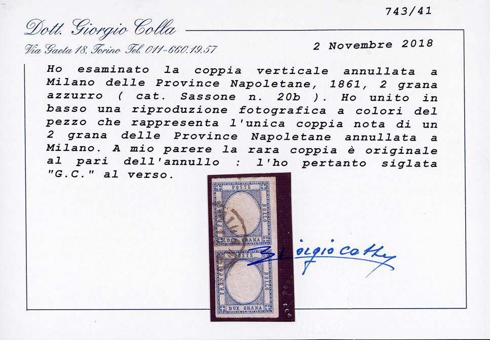 1861 - 2 grana azzurro (20b), coppia verticale, ECCEZIONALMENTE USATA A MILANO, lievi difetti. Insieme unico. Cert. Manzoni e Colla. Ex ... Leggi tutto