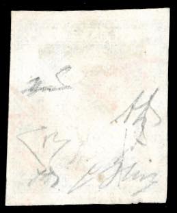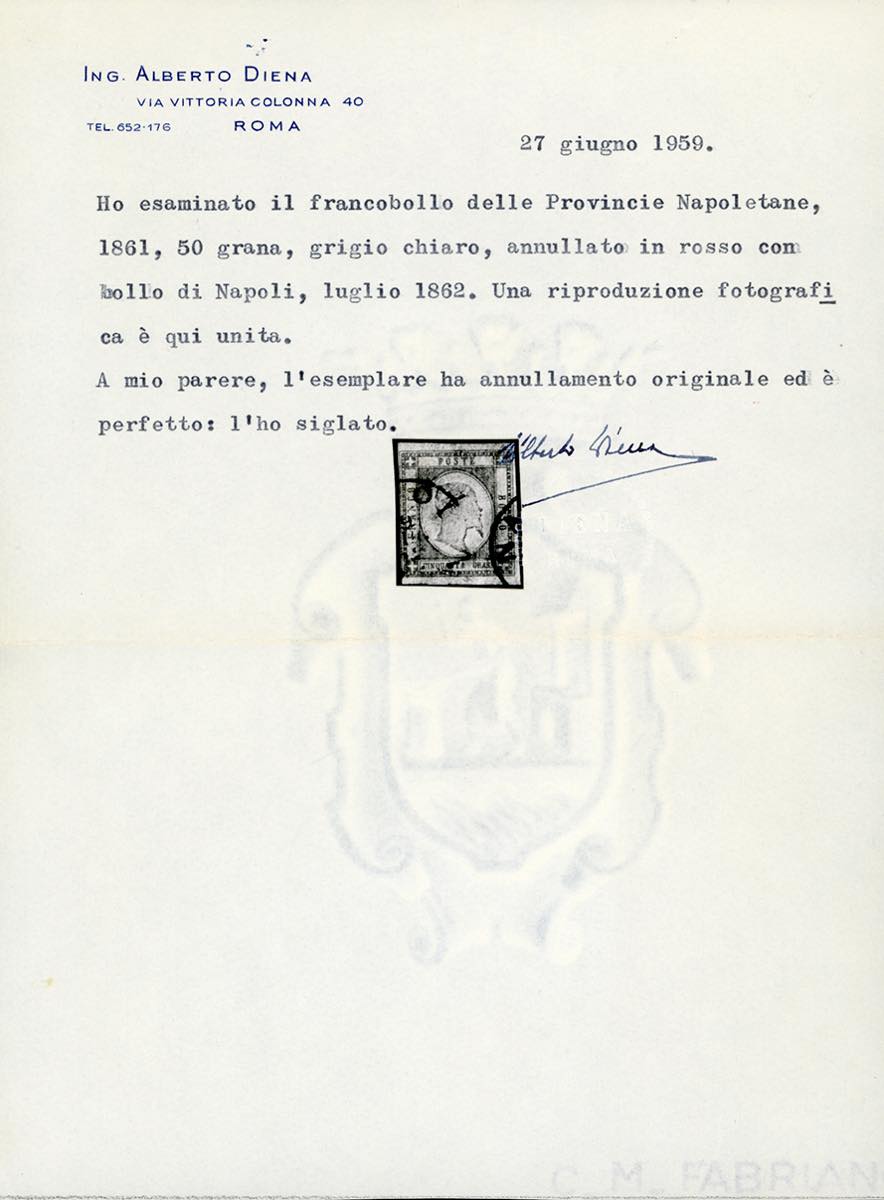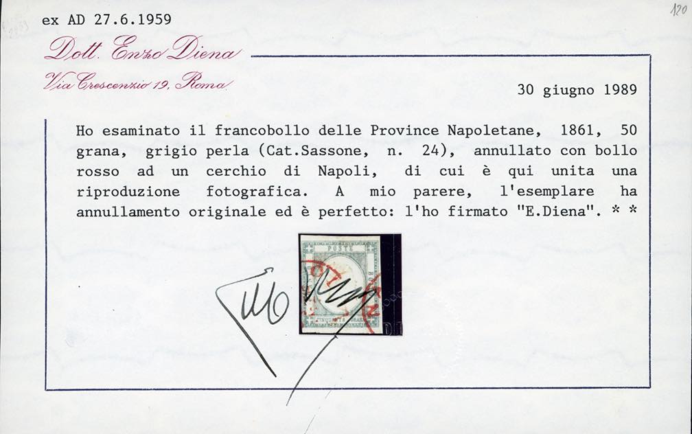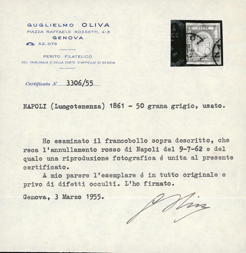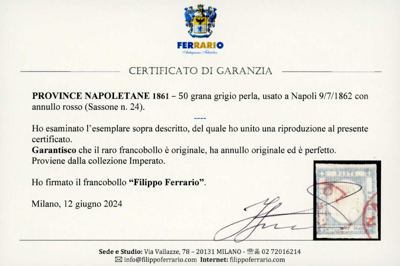 1861 - 50 grana grigio perla (24), perfetto, usato a Napoli 9/7/1862 con annulli rossi. Molto raro e pregiato questo francobollo con annullo rosso. Cert. A. ed E.Diena, G.Oliva e Ferrario. Ex coll. Imperato.
