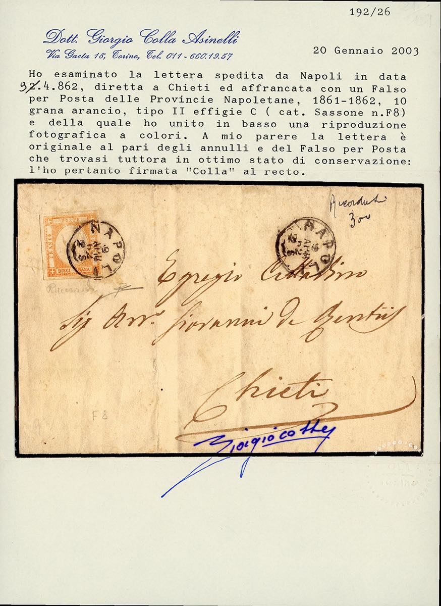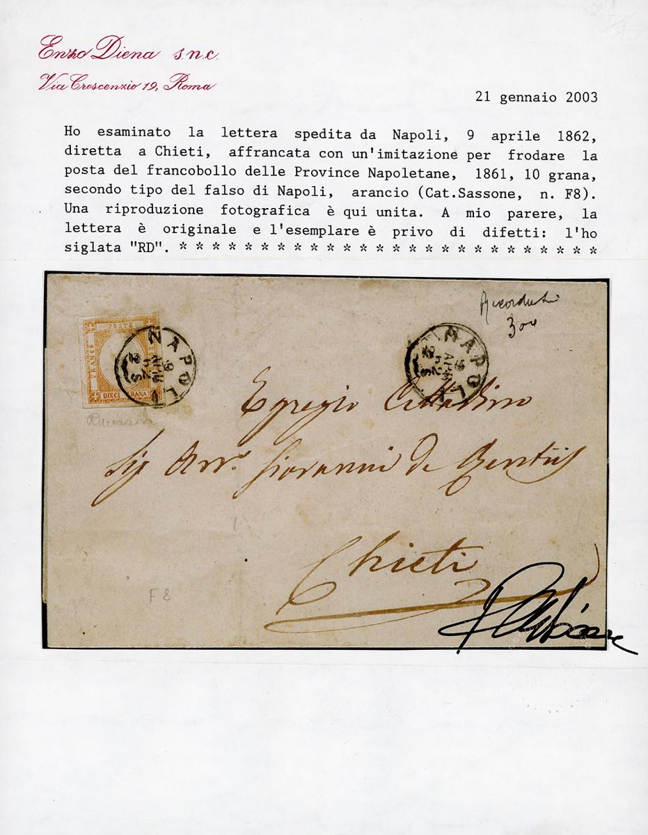 1862 - 10 grana arancio, falso per posta del II tipo, effigie tipo C (F8), perfetto, isolato su lettera da Napoli 9 aprile 1862 a Chieti, bollo d'arrivo. Mezzadri, Ferrario, cert. Diena e Colla.