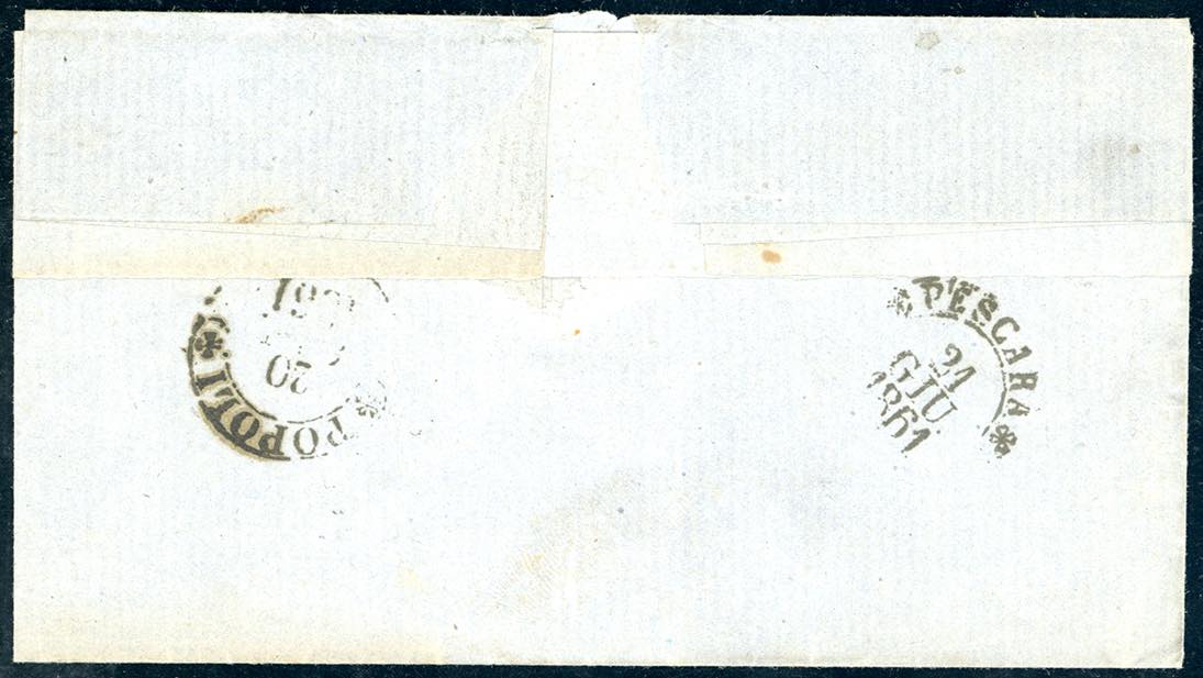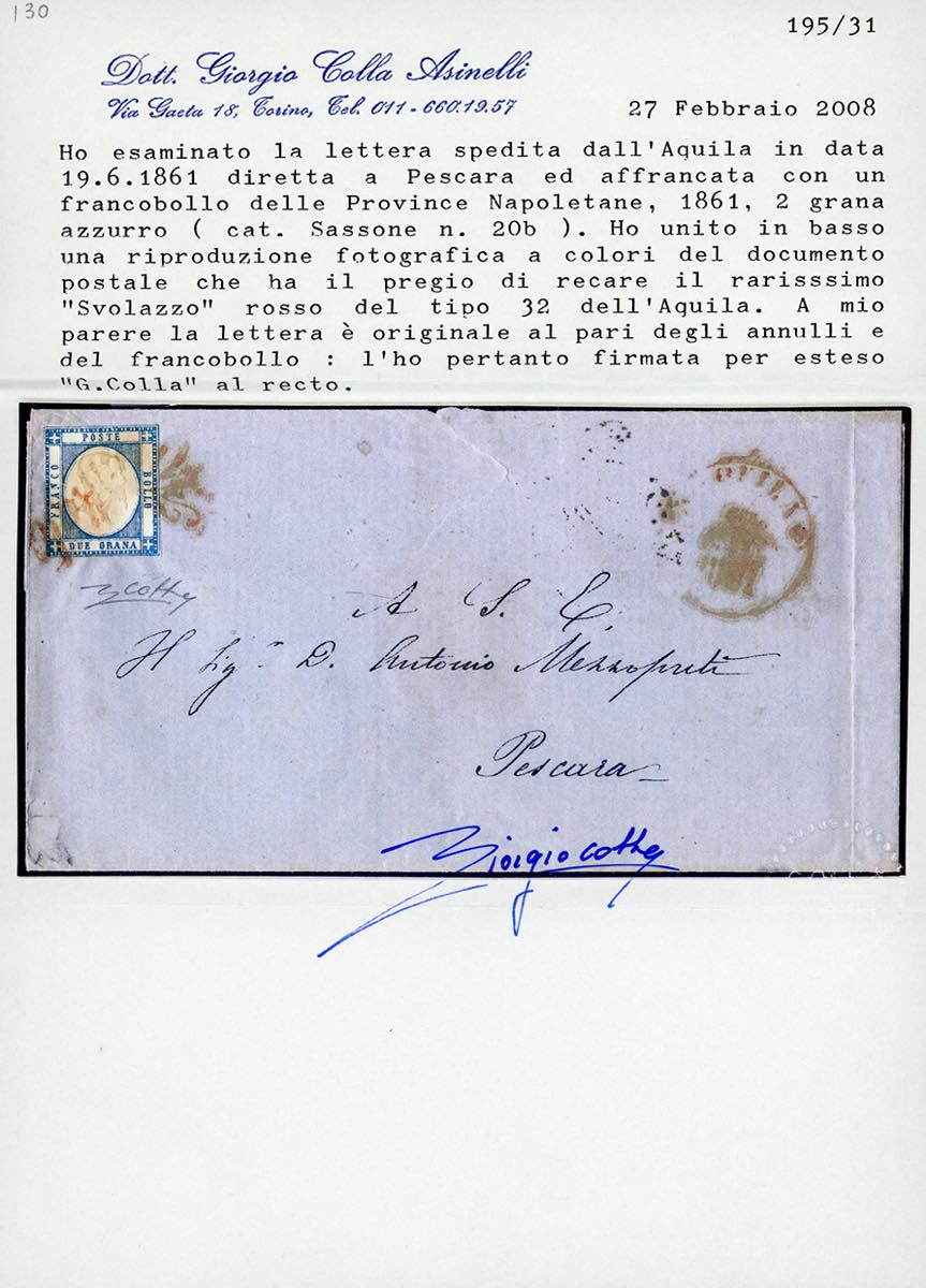 AQUILA, svolazzo + cerchio entrambi rossi punti R3 - 2 grana (20b), ritagliato lungo i margini "lilliput", su sovracoperta di lettera del 19/6/1861 per Pescara. Rarità del settore, DUE LETTERE NOTE. Cert. Colla. Ex coll. Imperato (cat.Sassone € 35.000/52.500).