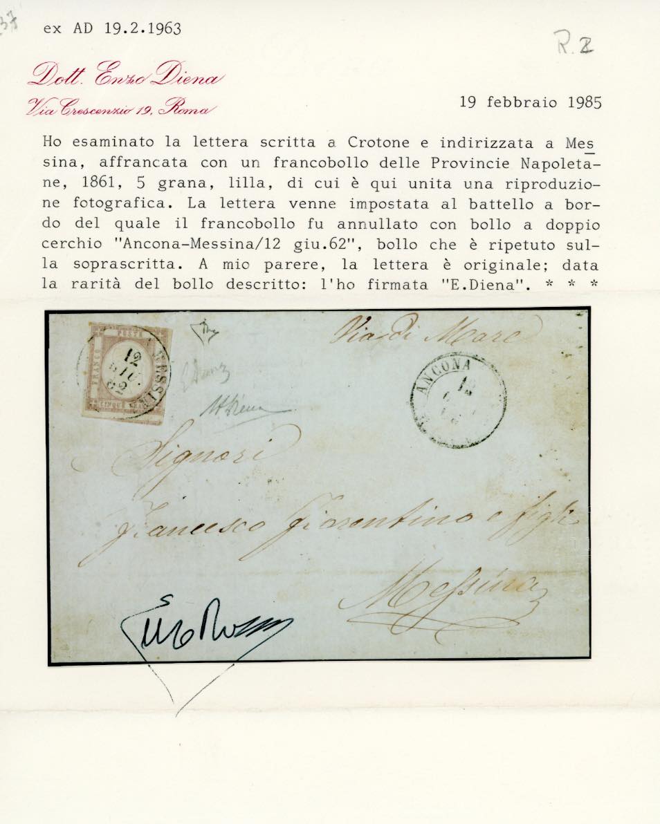 DA ANCONA A MESSINA, punti R2 - 5 grana (Province Napoletane 21c), sfiorato in alto, su sovracoperta di lettera scritta a Crotone e impostata direttamente sul battello il 12/6/1862 a Messina. Rarissima, PROBABILMENTE UNICA. Em.Diena, cert. A. ed E.Diena. Ex coll. Imperato.