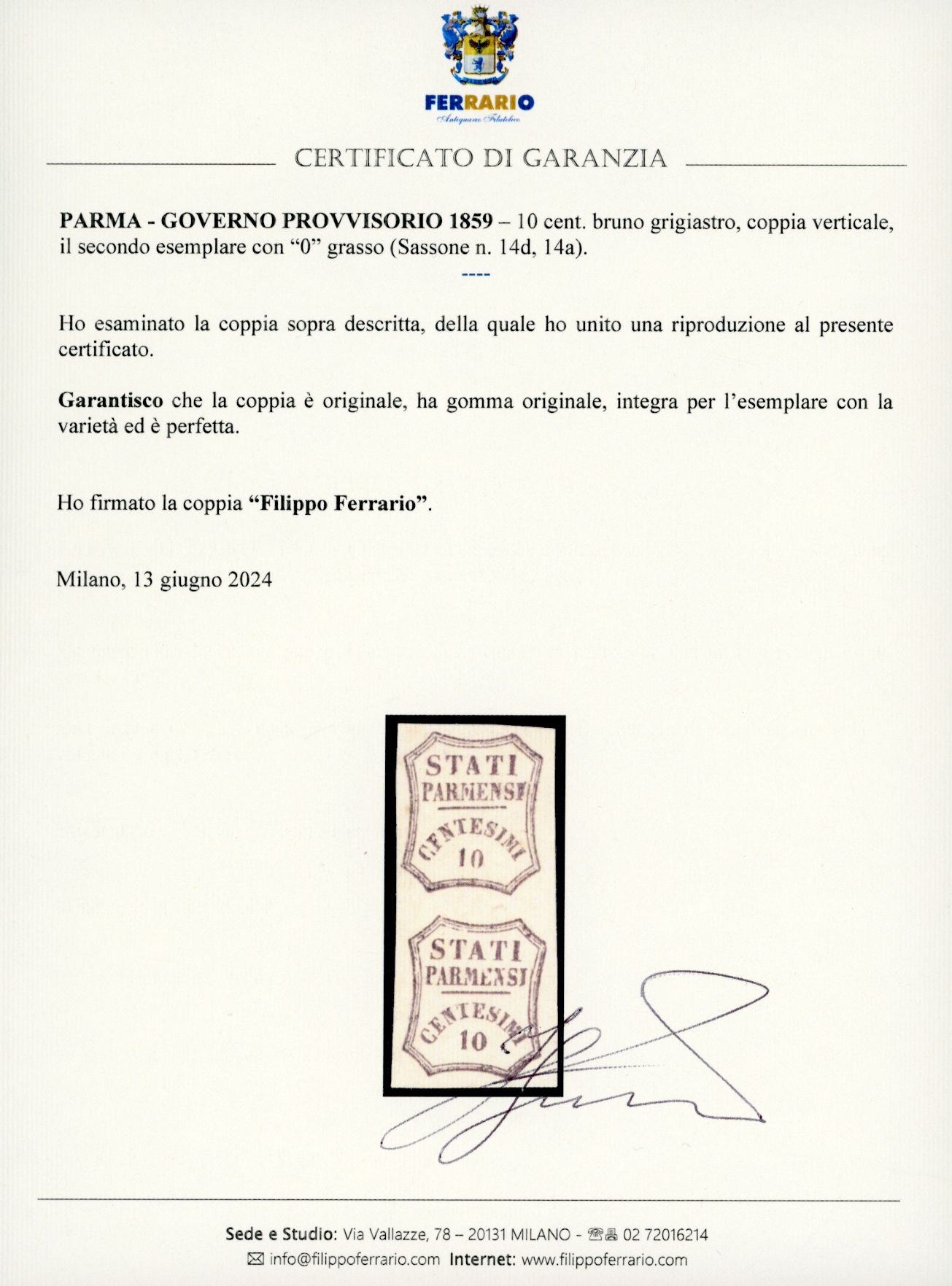 1859 - 10 cent. bruno grigiastro, coppia verticale, il secondo esemplare con "0" grasso (14d,14a), gomma originale, integra per l'esemplare con la varietà, perfetta. Molto bella. G.Oliva, A.Diena, cert. Ferrario.